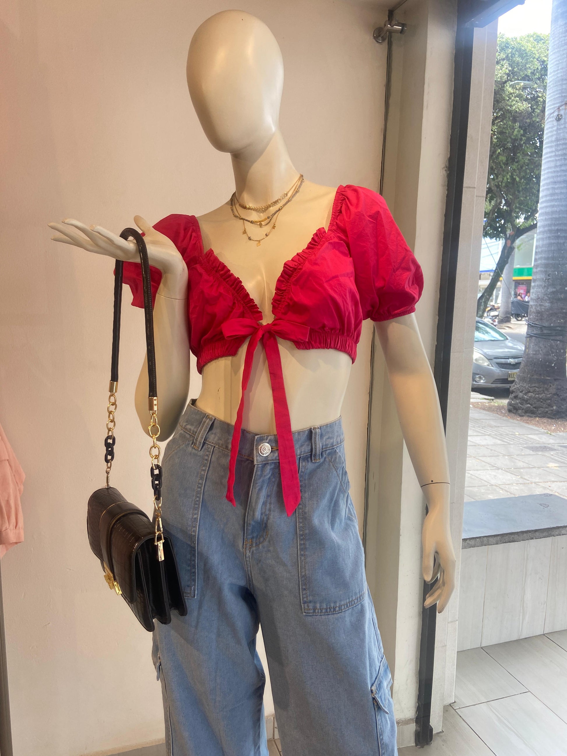 Crop top con manga bombacha y nudo ajustable en delantero. Elaborada en popelina.
