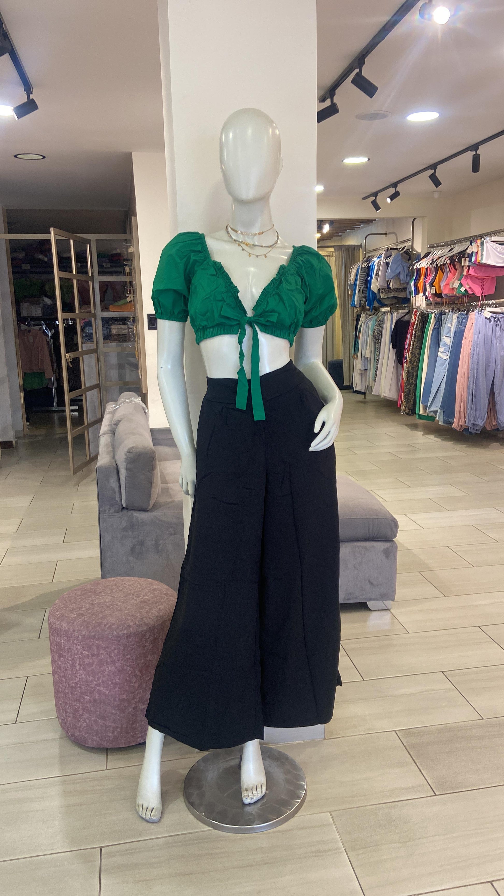 Crop top con manga bombacha y nudo ajustable en delantero. Elaborada en popelina.