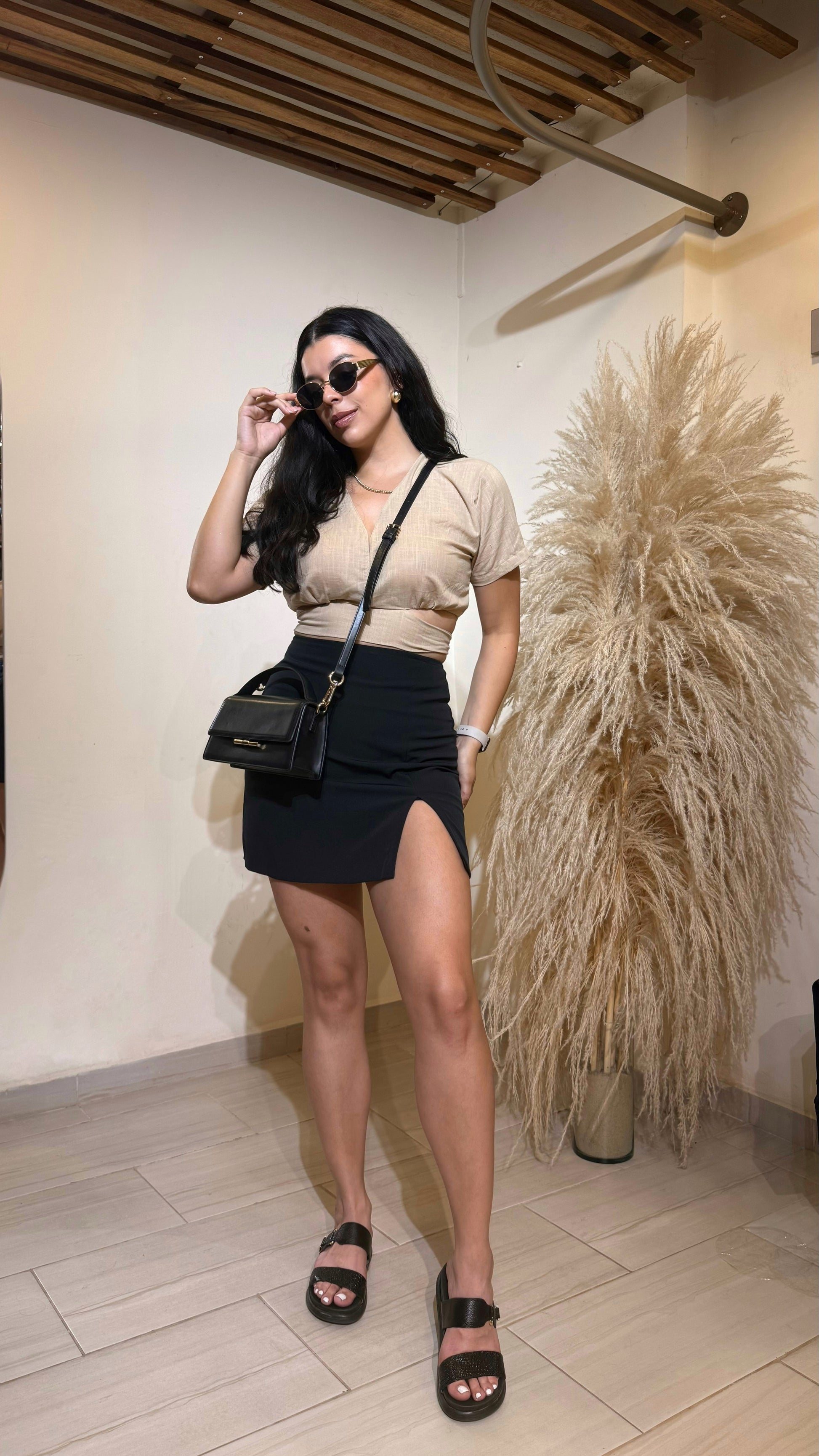 Blusa manga corta, cuello en V, con fajón de ajuste en la cintura. Elaborado en lino.