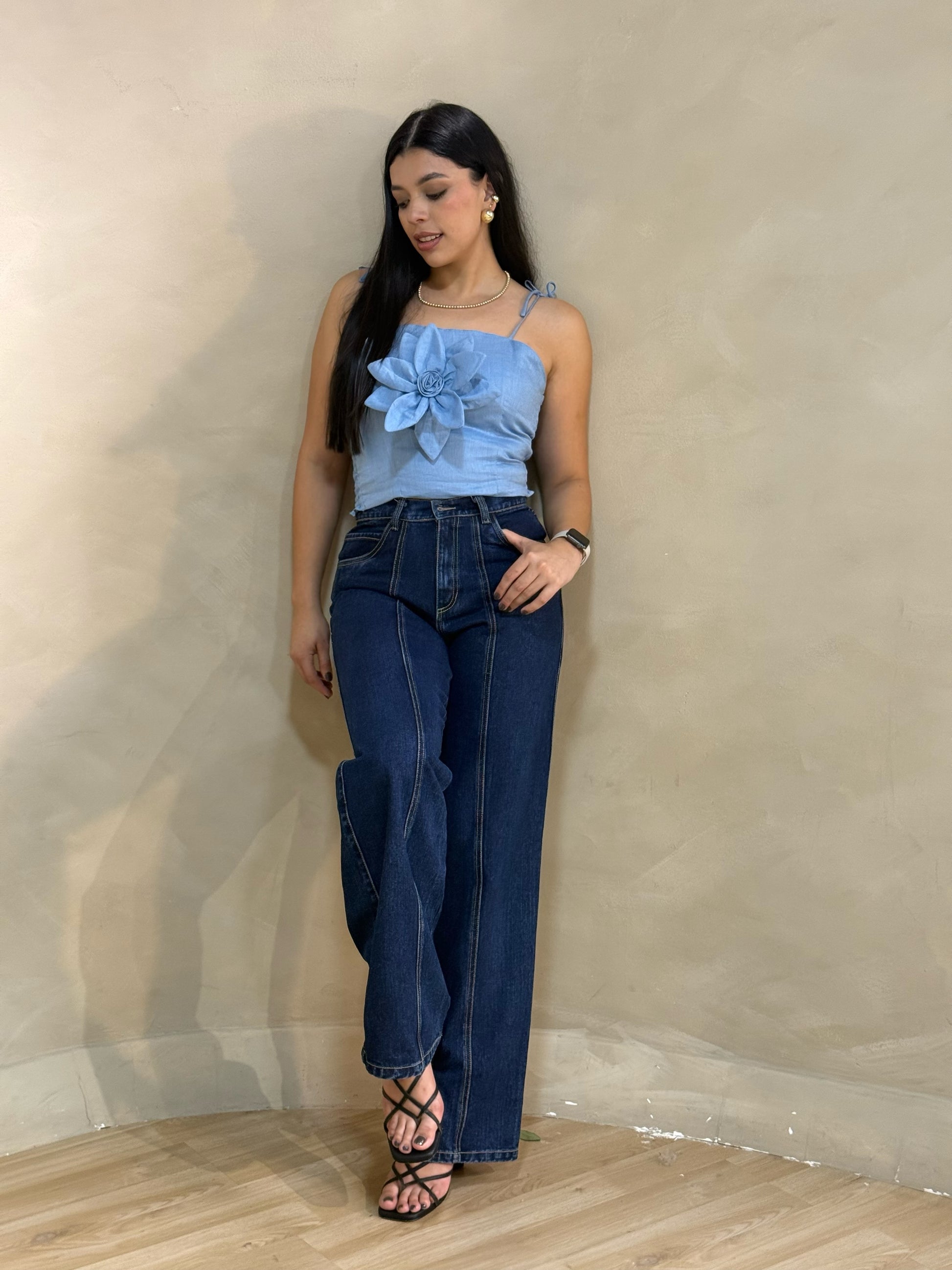 Blusa de tiras ajustables, con encauchado en la espalda, flor forrada elaborada a mano con sistema de retirar y poner con nodrizas. Elaborada en Lino 100%.