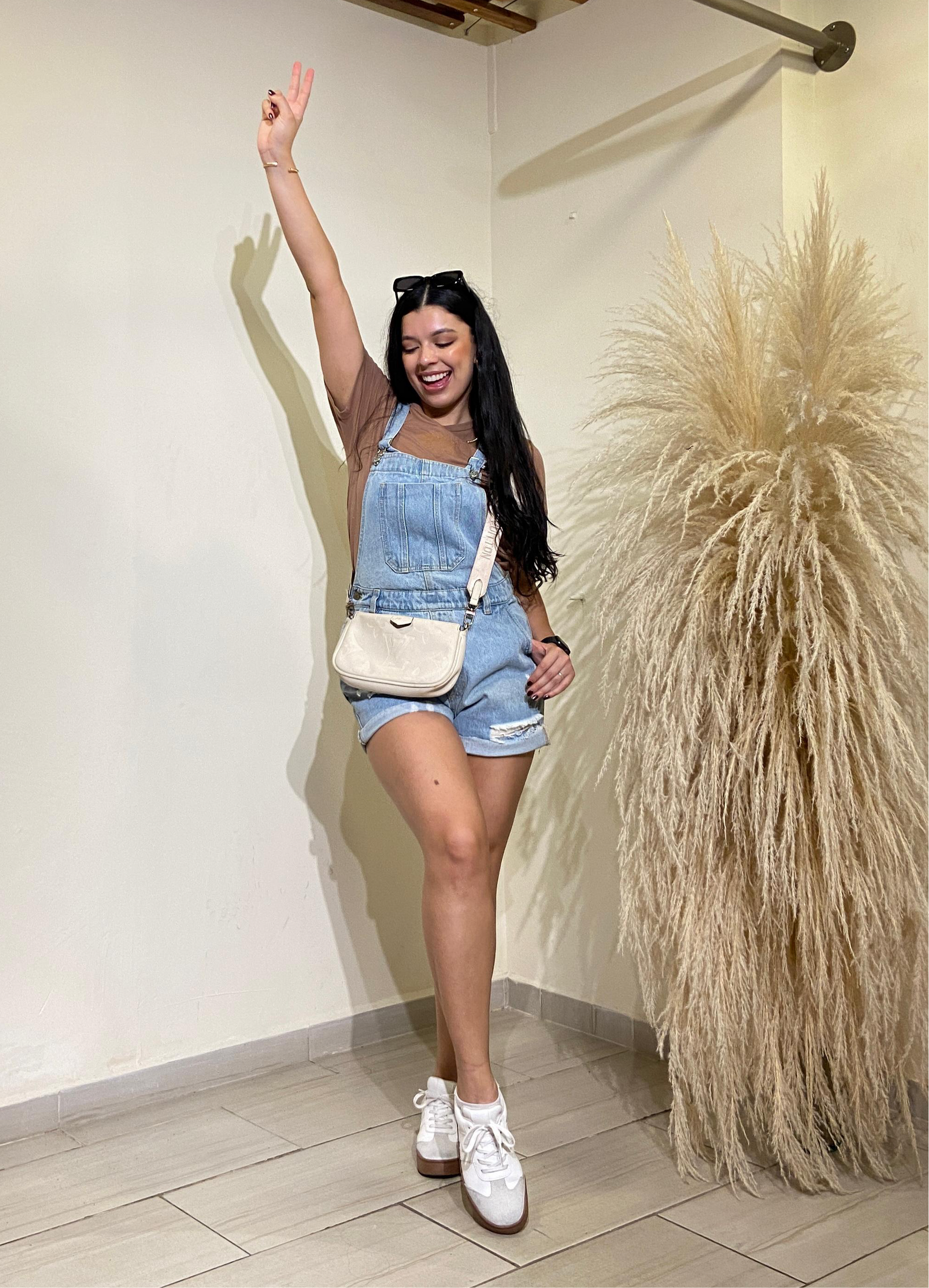 Braga de short con bolsillos laterales y posteriores con sistema de cierre con botón. Bolsillo frontal en el pecho. Elaborado en denim rígido 100% algodón.