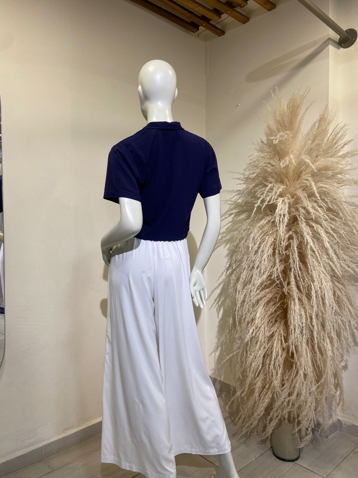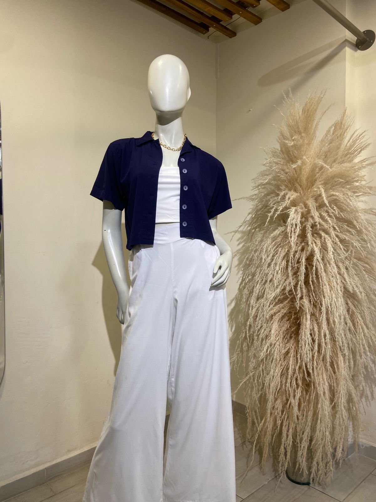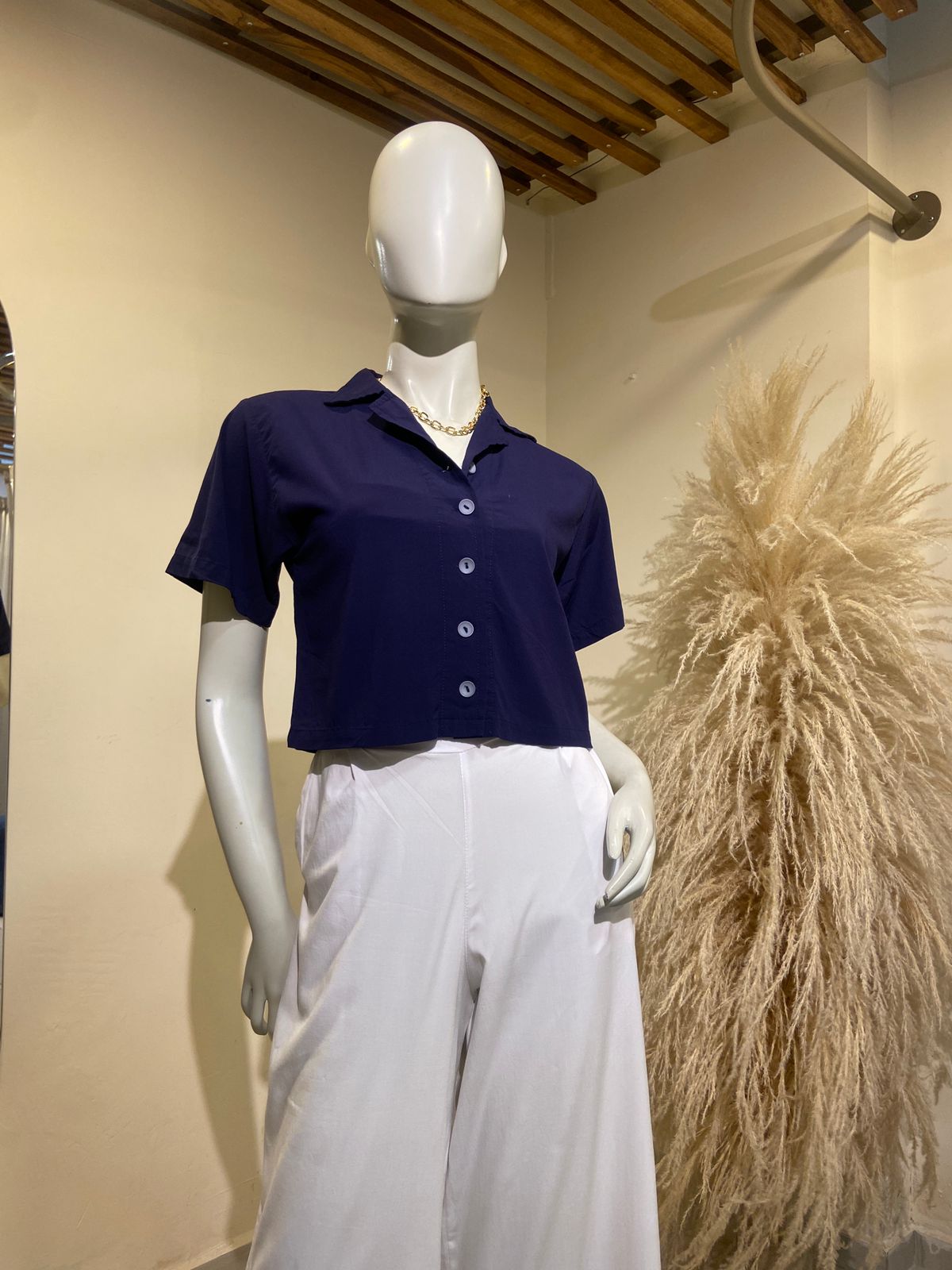 Camisera corta con cuello y botonera silueta amplia. Elaborada en rayón100% algodón.