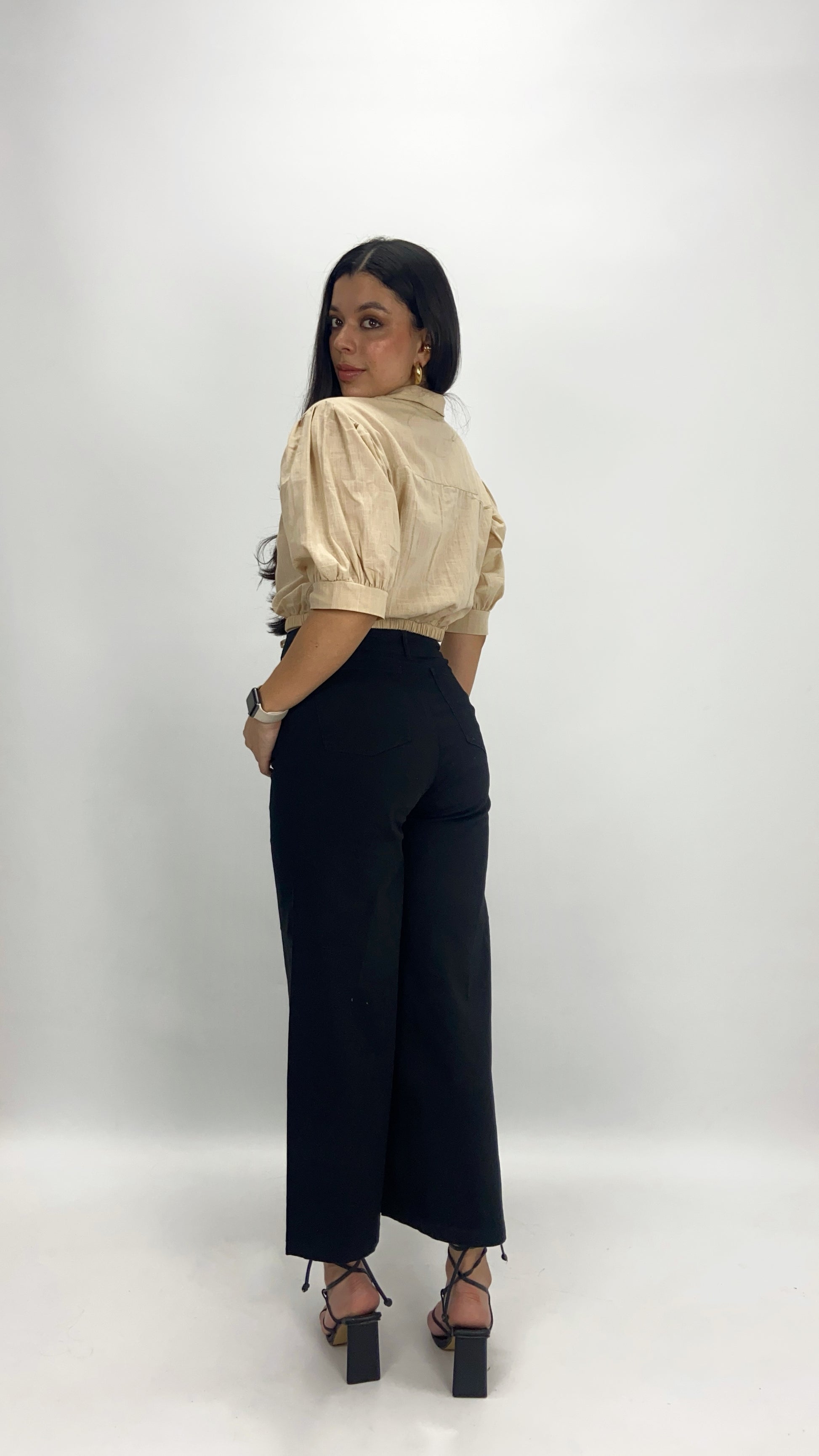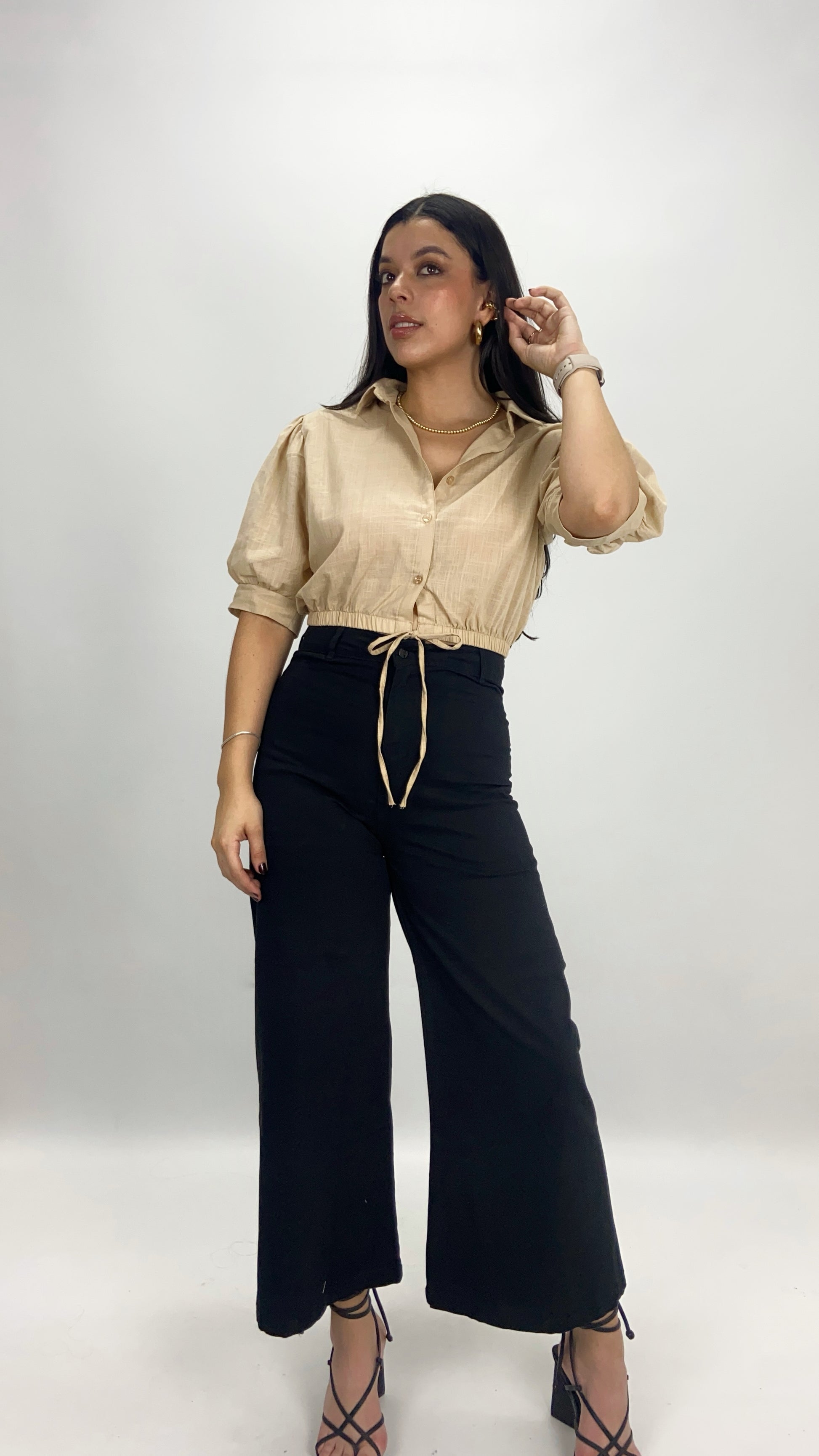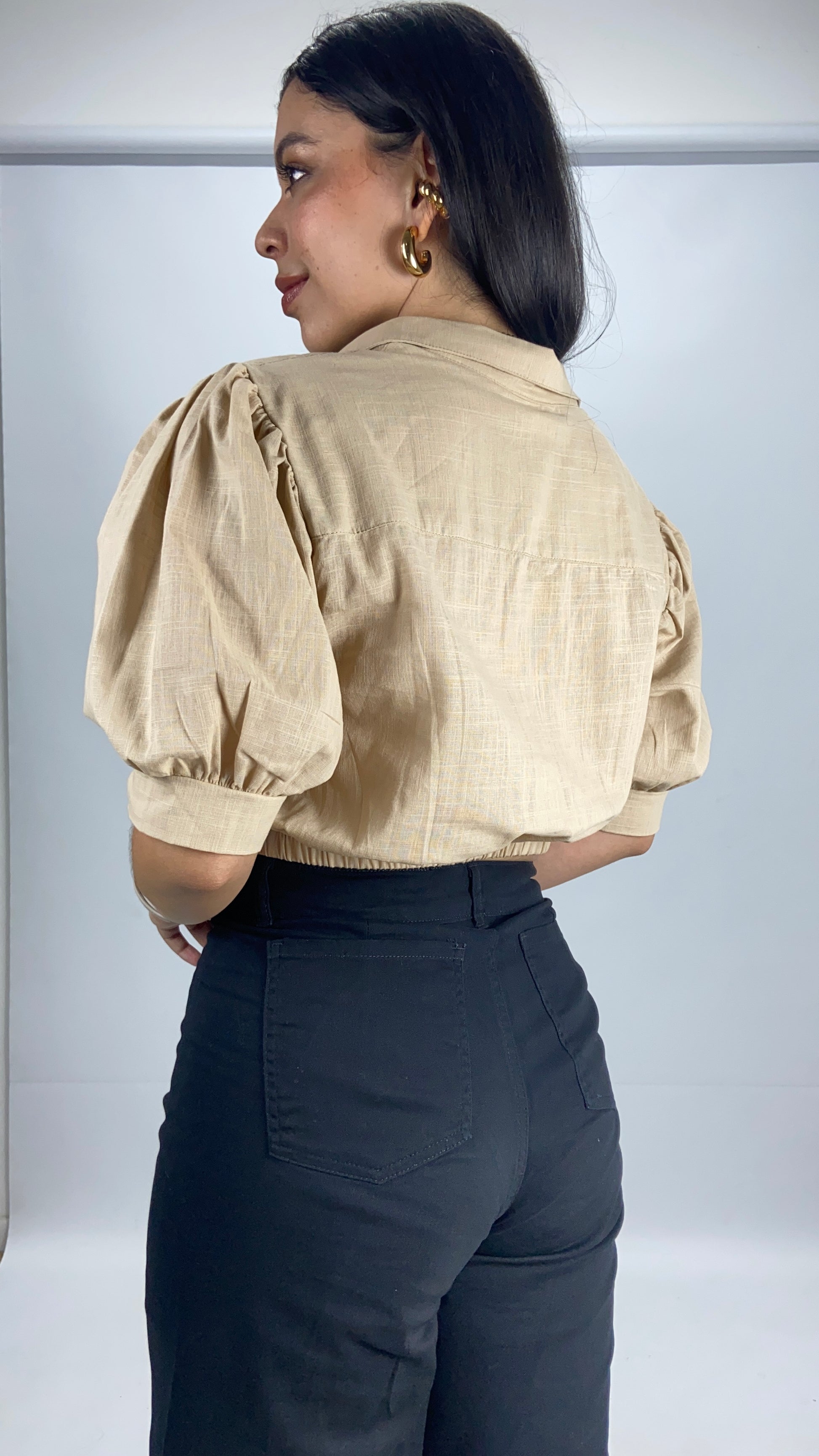 Camisera manga bombacha 3/4, encauchada en la cintura y botonera clásica. Elaborada en lino.