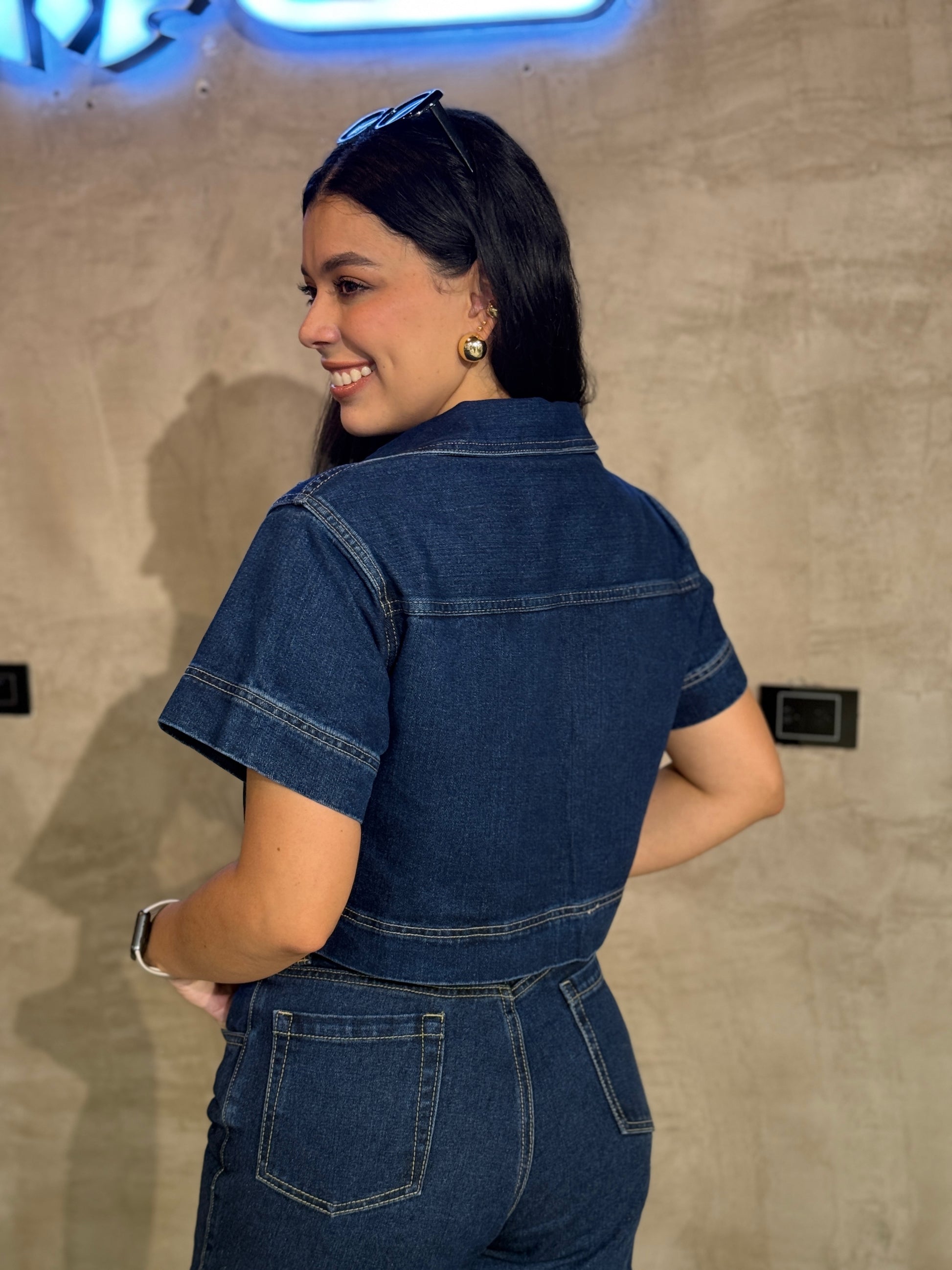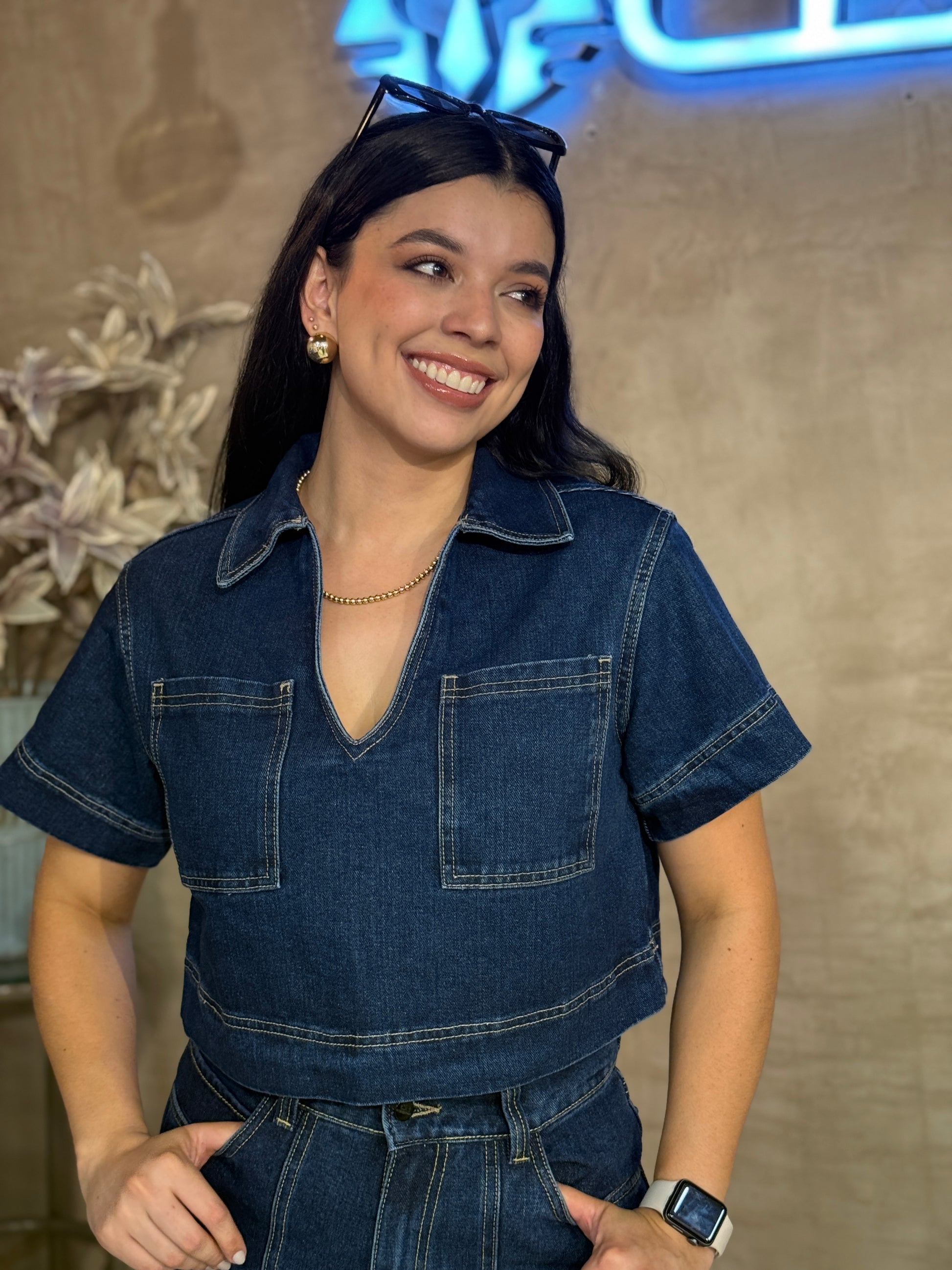 Camisera manga corta, silueta amplia, cuello clásico y con 2 bolsillos funcionales delanteros. Elaborada en denim rígido.