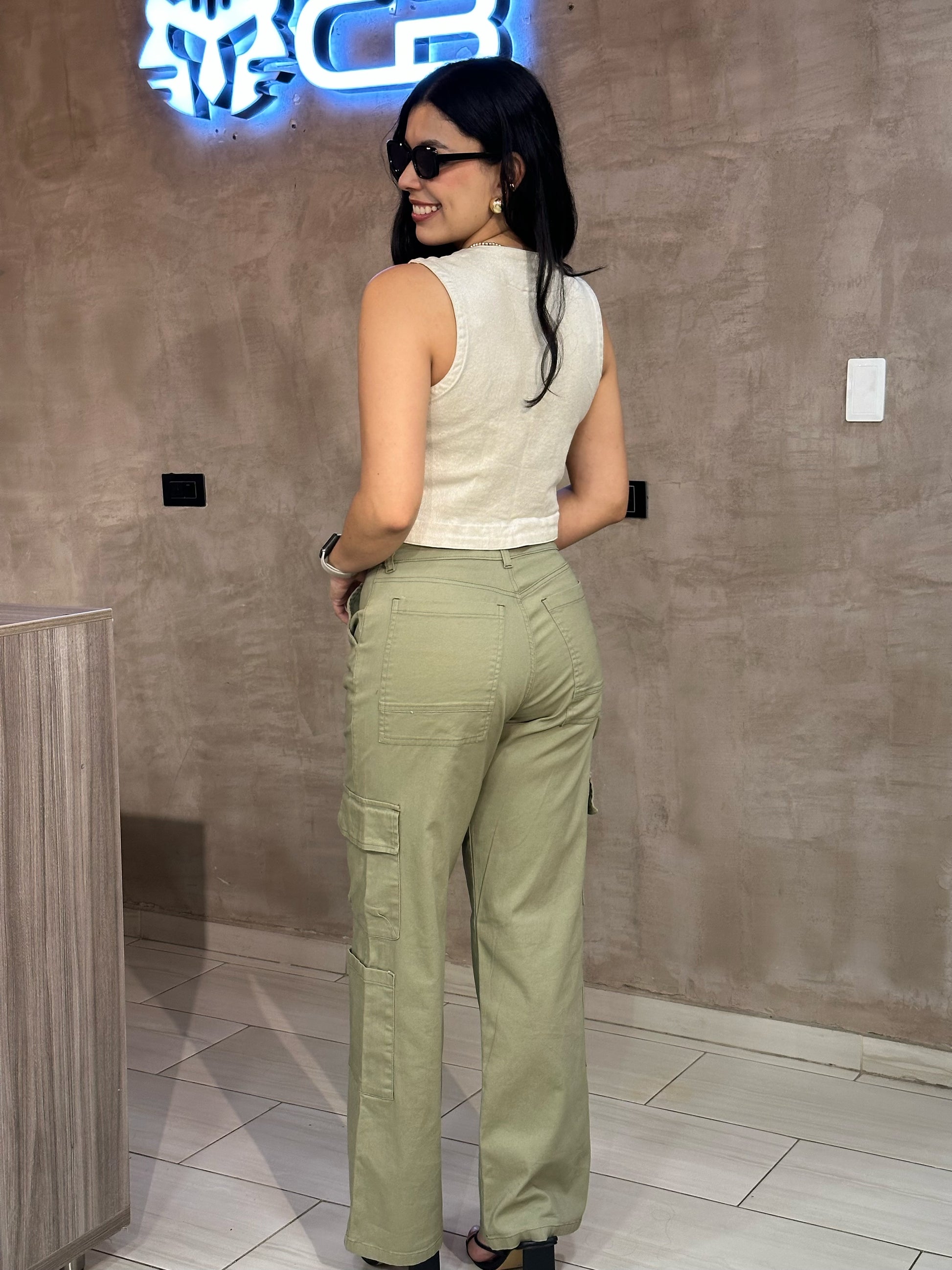 Pantalón cargo 5 bolsillos, tiro alto, con 4 bolsillos laterales funcionales. Elaborado en drill licrado.