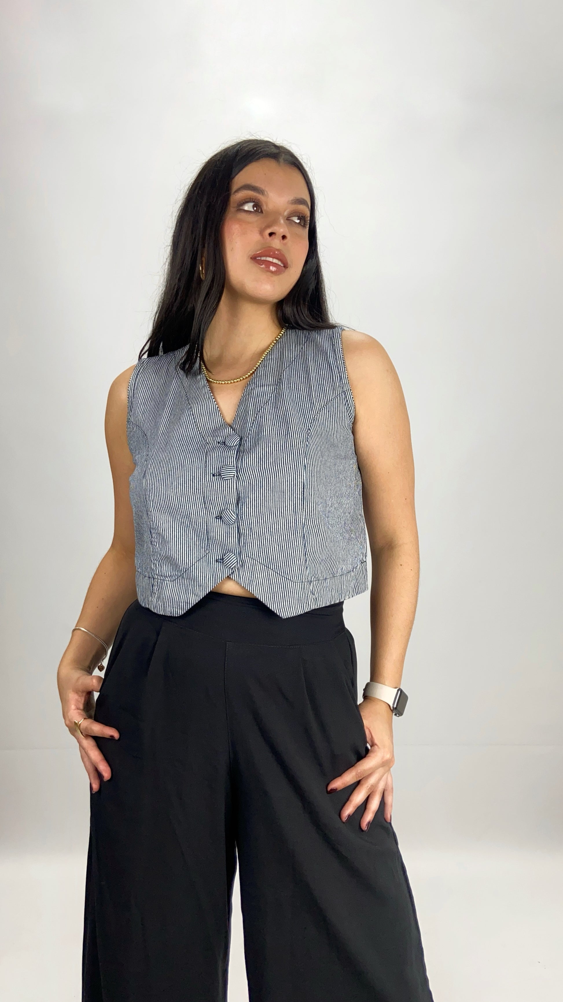 Chaleco clásico, con botones forrados. Elaborado en drill a rayas.