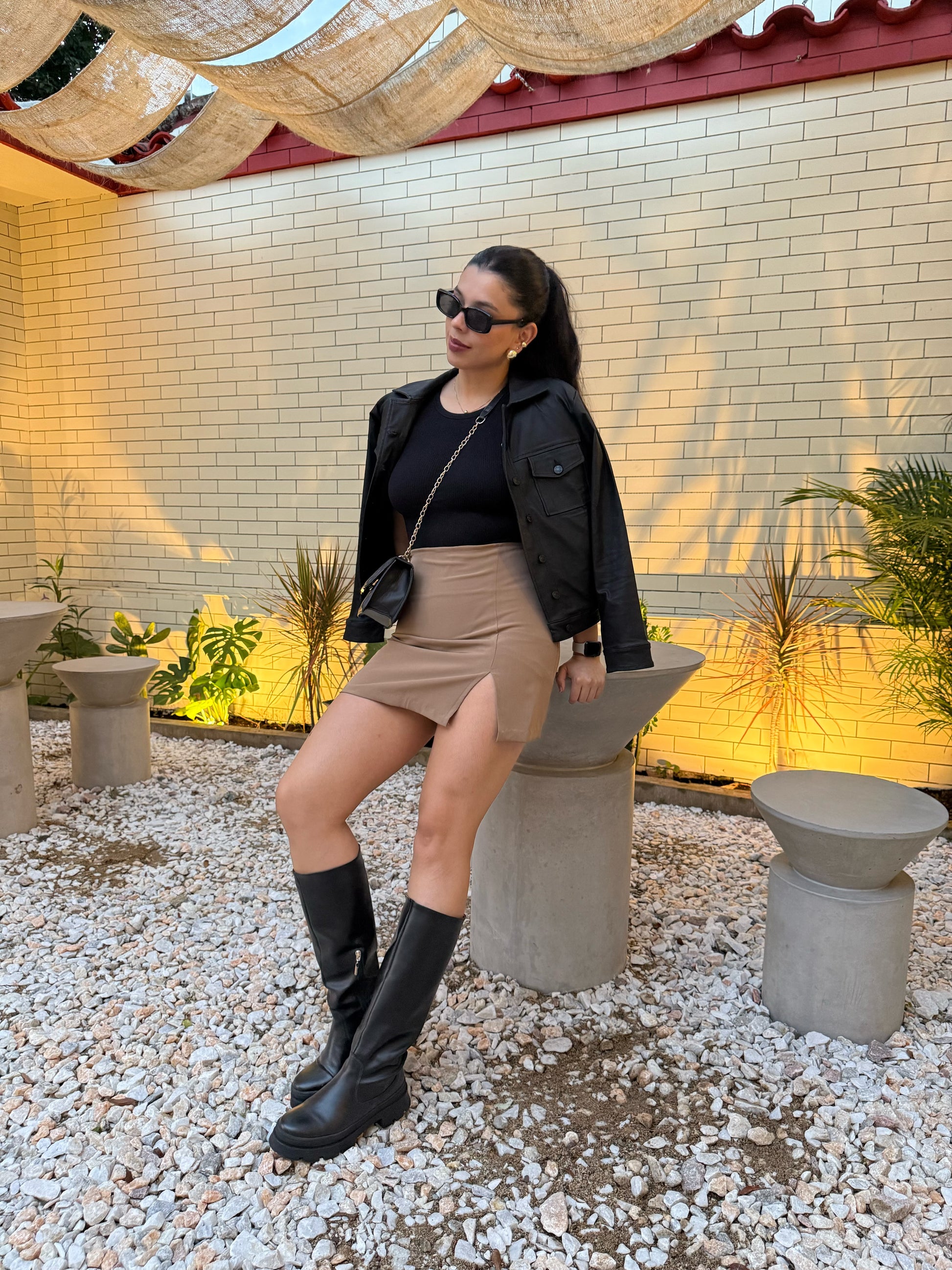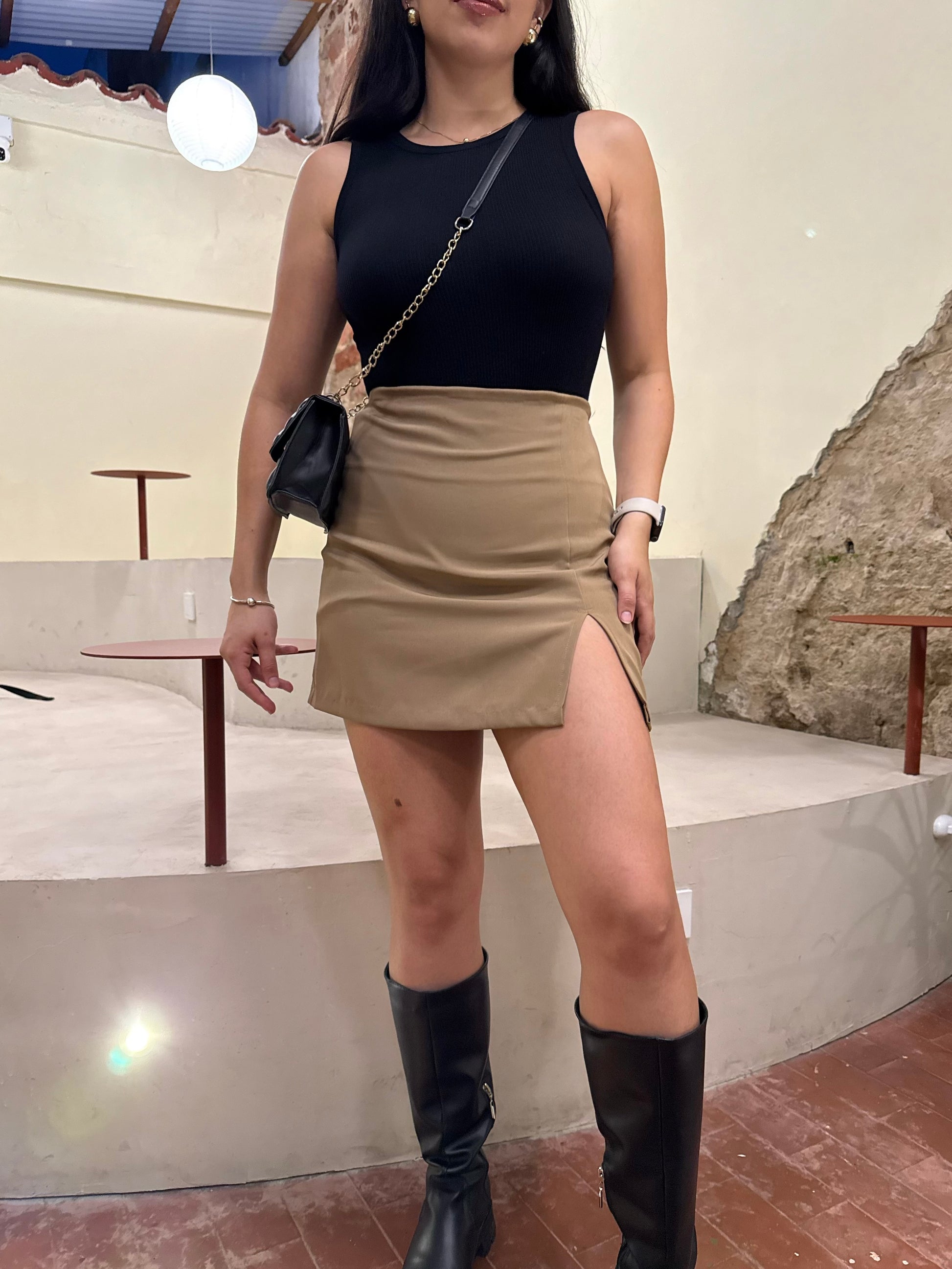 Falda corta con abertura al frente, silueta semi ajustada, textura lisa, pretina forrada, cierre invisible a un costado, dobladillo invisible. Una prenda moderna infaltable en tu closet.