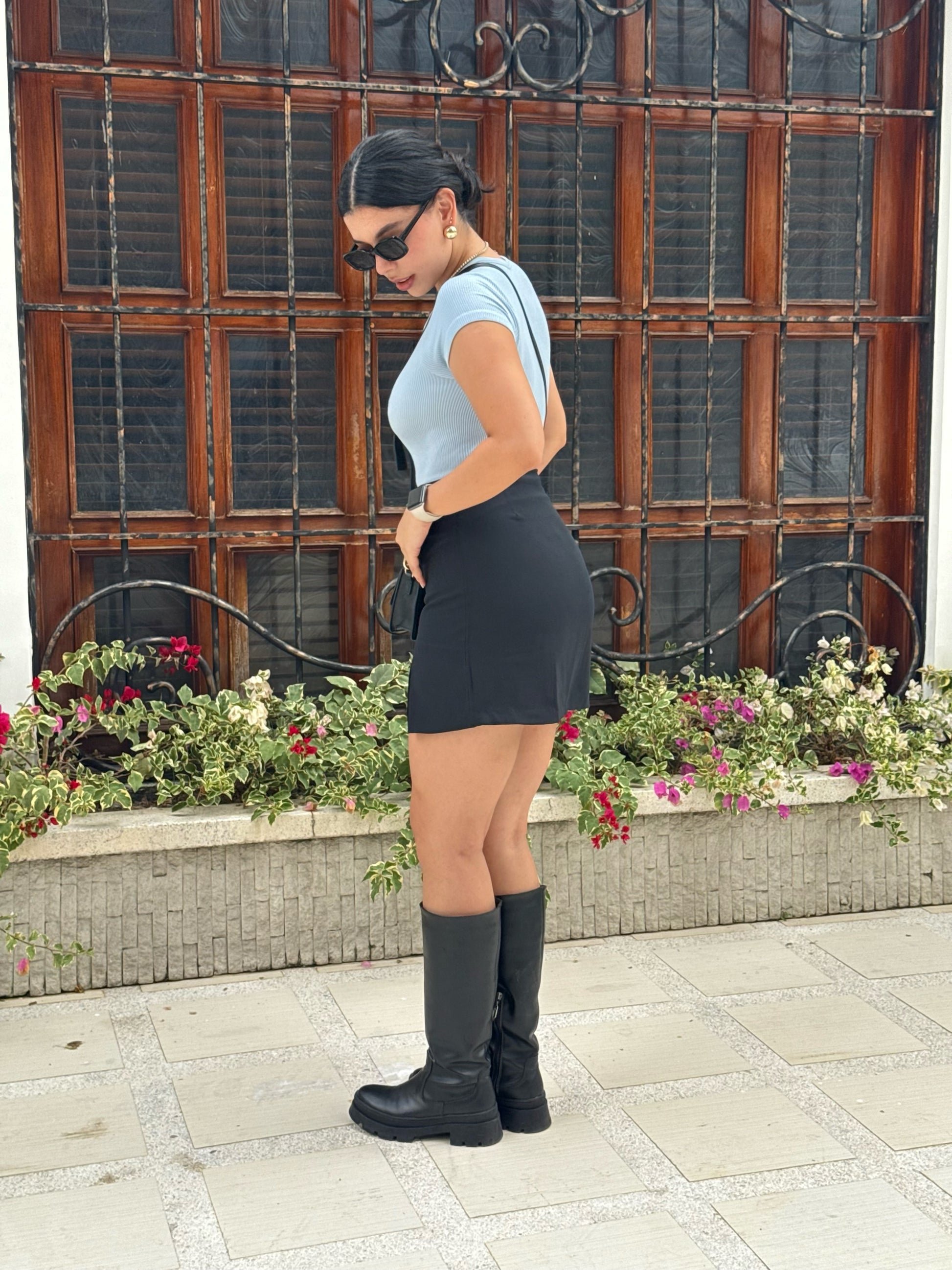 Falda corta con abertura al frente, silueta semi ajustada, textura lisa, pretina forrada, cierre invisible a un costado, dobladillo invisible. Una prenda moderna infaltable en tu closet.