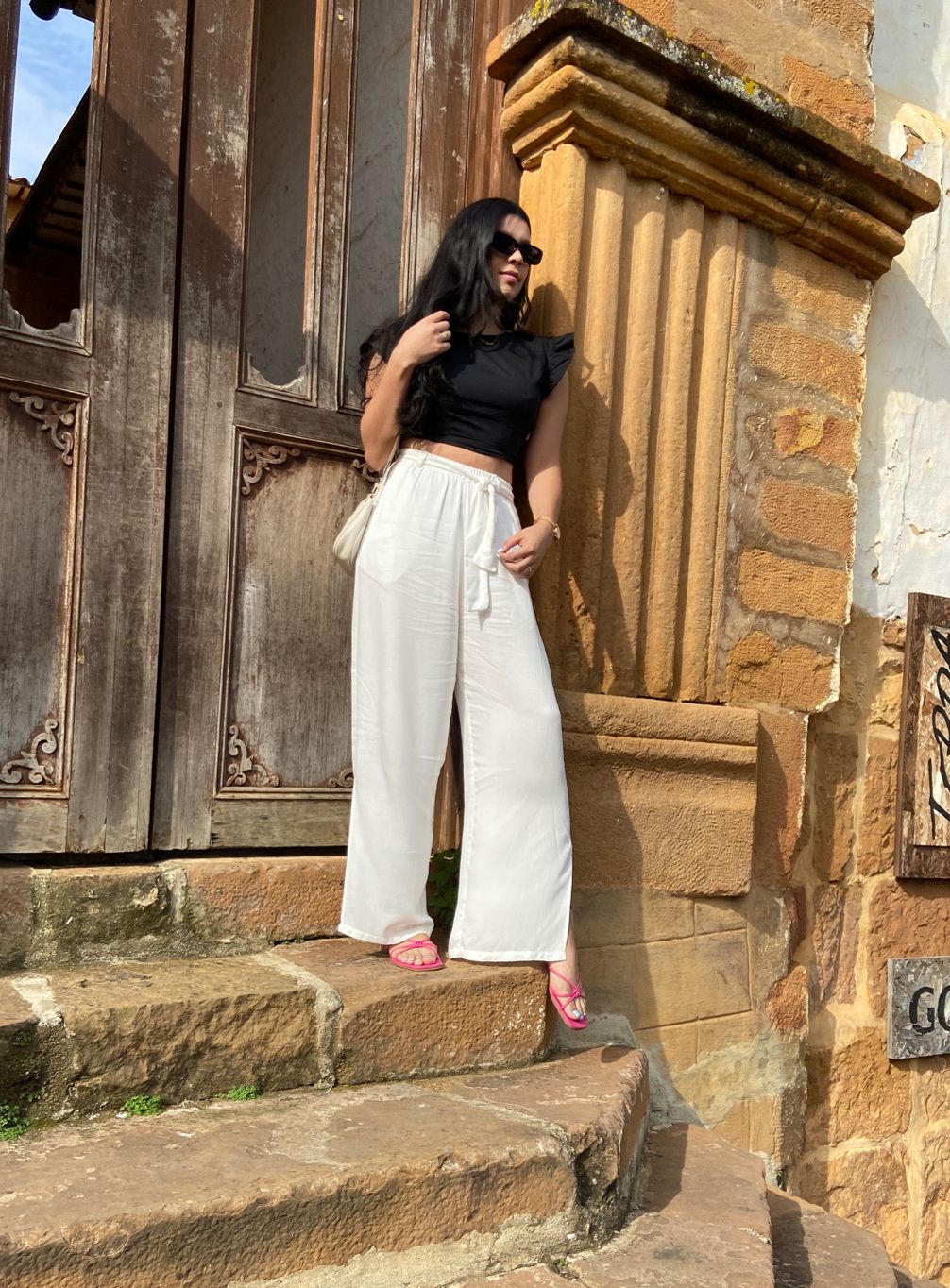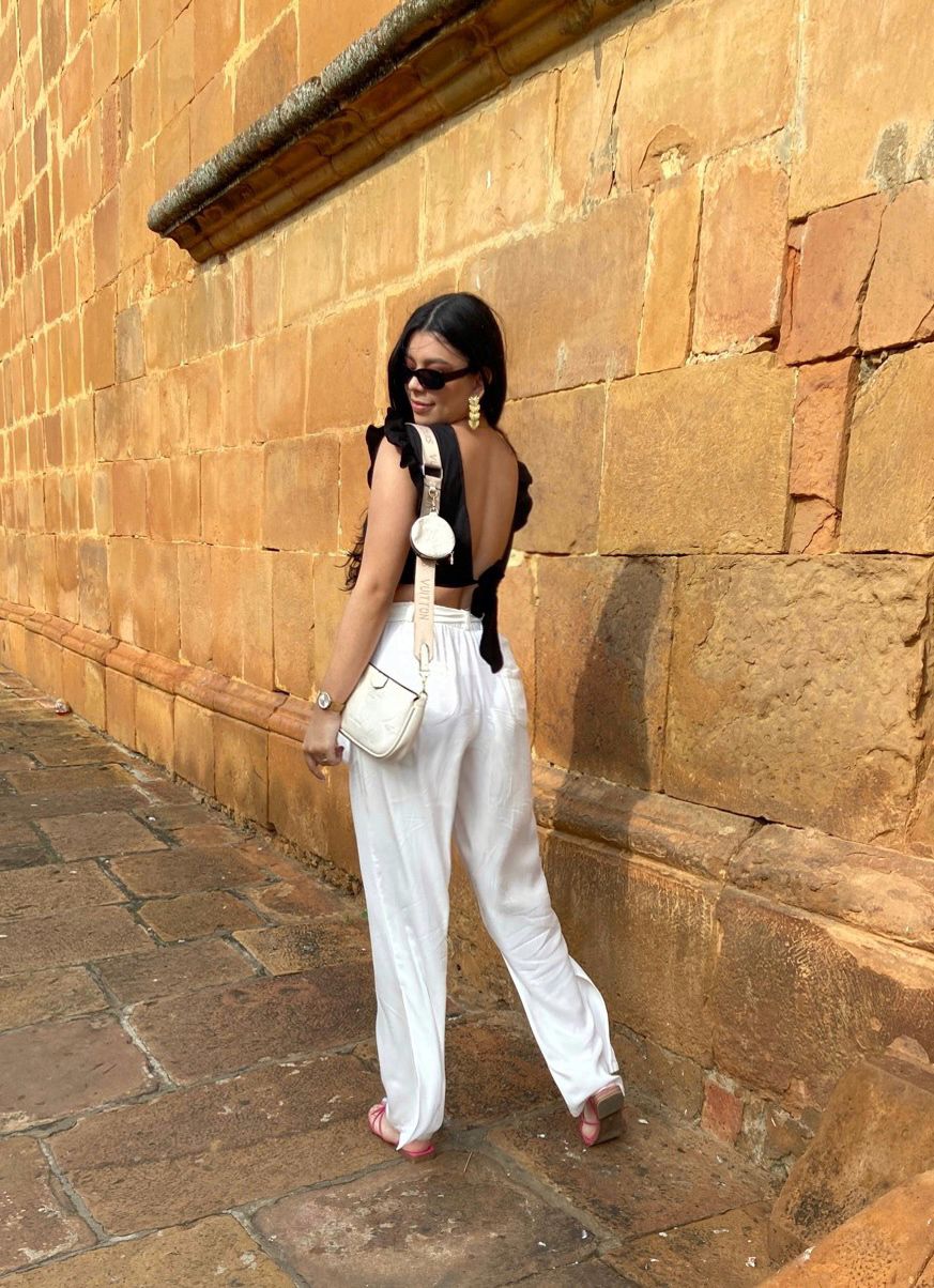 Pantalón encauchado tiro alto con fajón, con bolsillos laterales y posteriores. Silueta amplia. Elaborado en rayón.