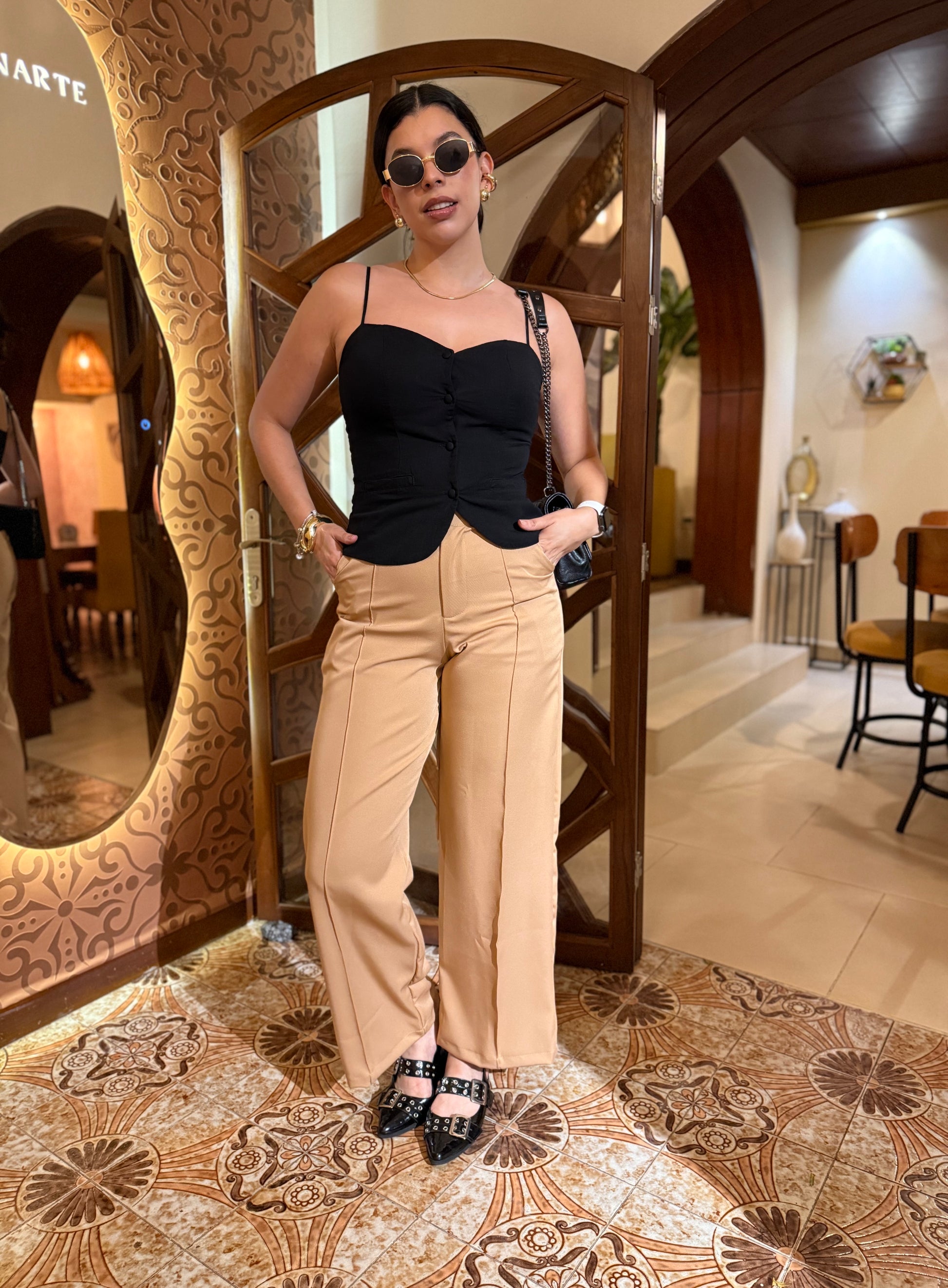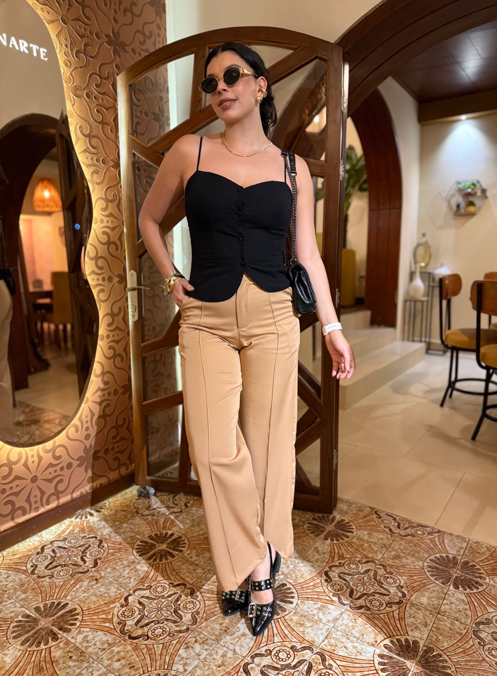 Pantalón tipo palazzo tiro alto, botonera y cierre frontal, bota recta. Tela drill licrado. Silueta ajustada.