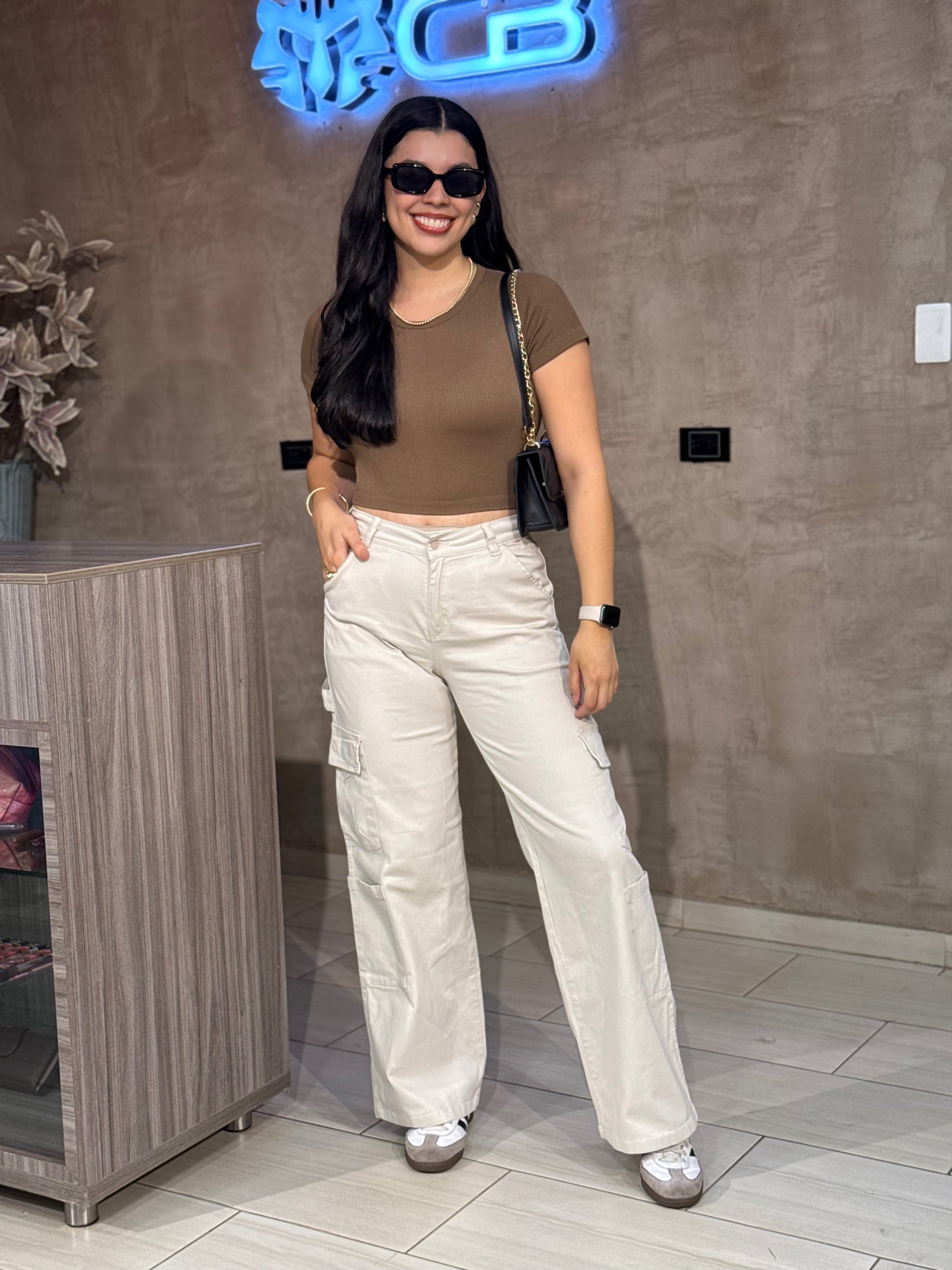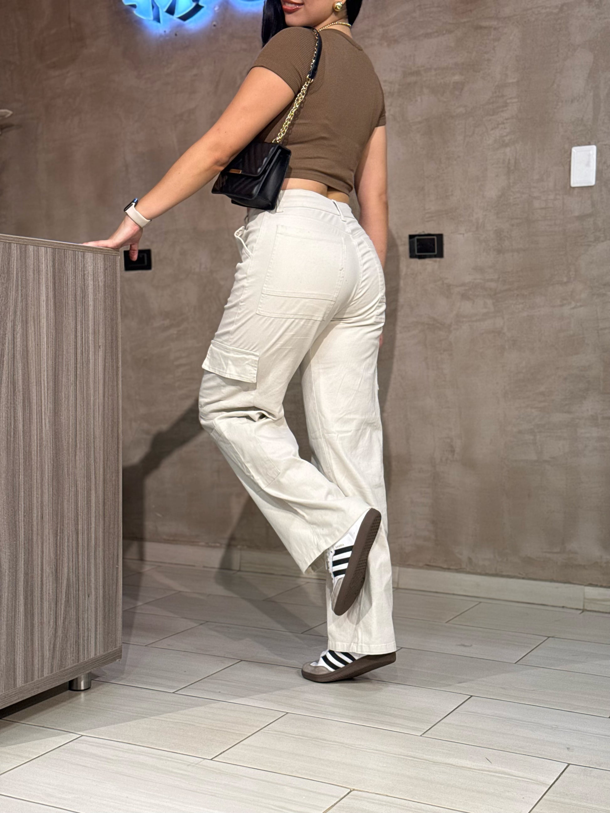 Pantalón cargo 5 bolsillos, tiro alto, con 4 bolsillos laterales funcionales. Elaborado en drill licrado.