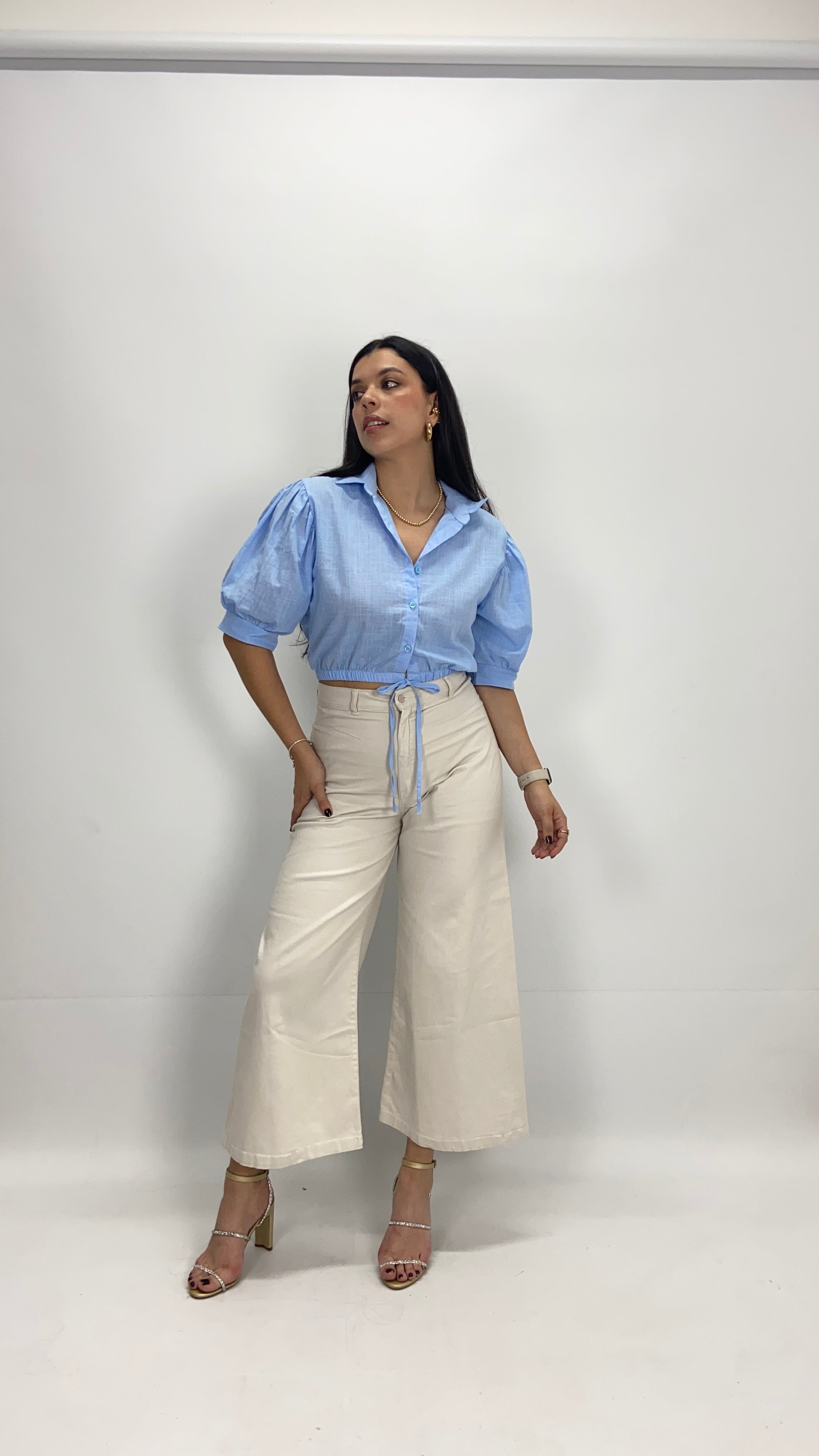 Pantalón culotte, cuenta con 2 bolsillos posteriores, tiro alto, botas anchas y una silueta ajustada desde la cintura hasta la rodilla. Elaborado en drill licrado.