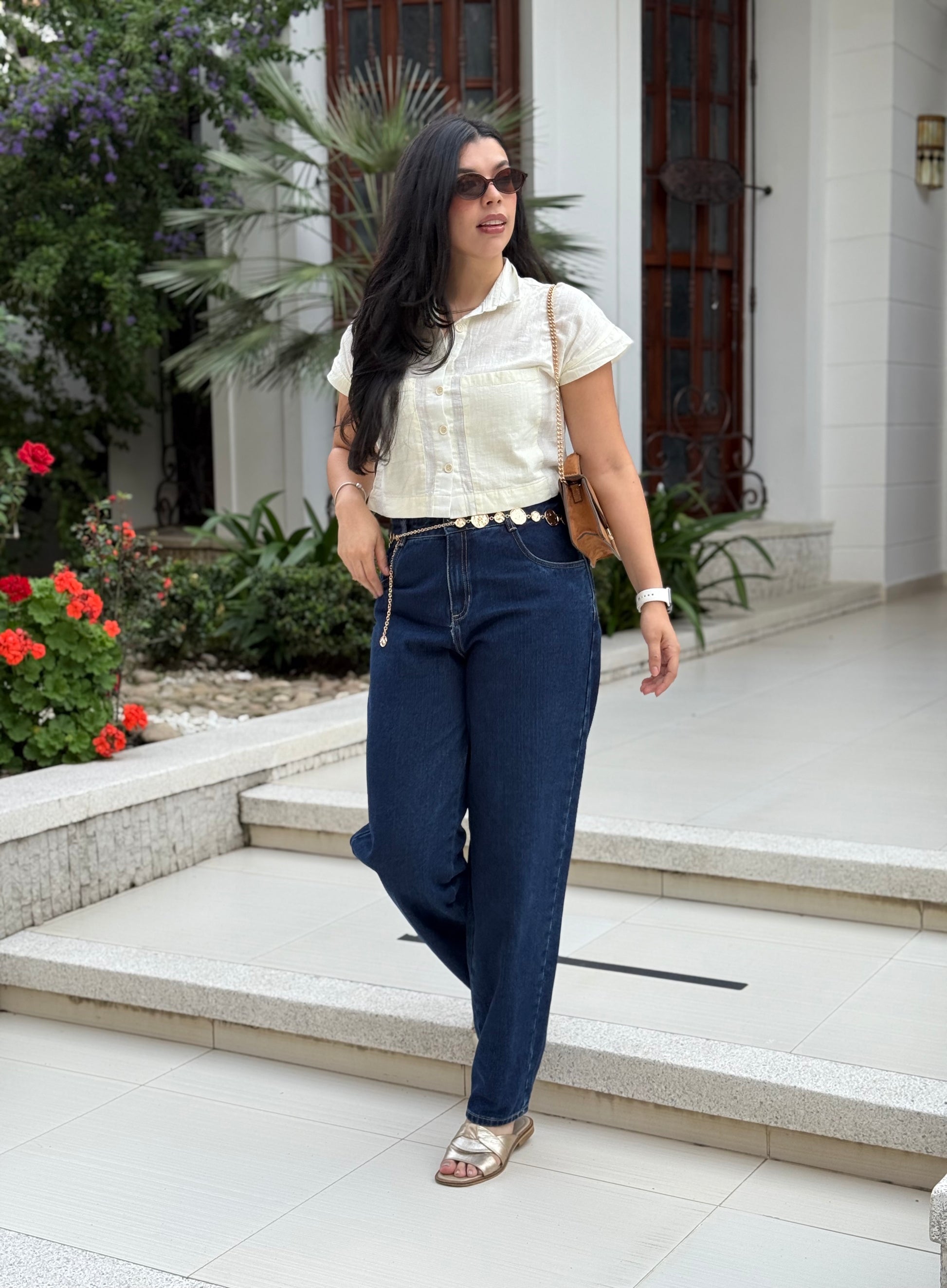 Pantalón jean tobillero de cinco bolsillos, ligeramente elástico. Tiro alto con cierre de cremallera y piernas ligeramente amplias arriba y más ajustadas en el tobillo. Elaborado en denim rígido.