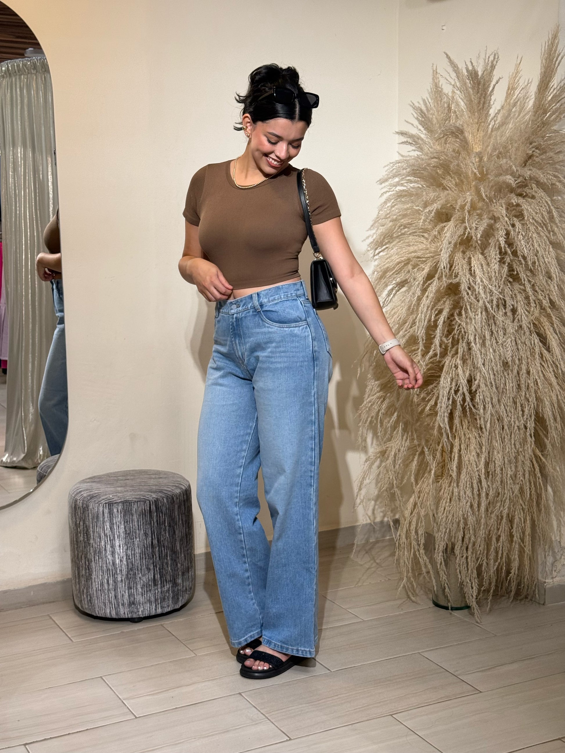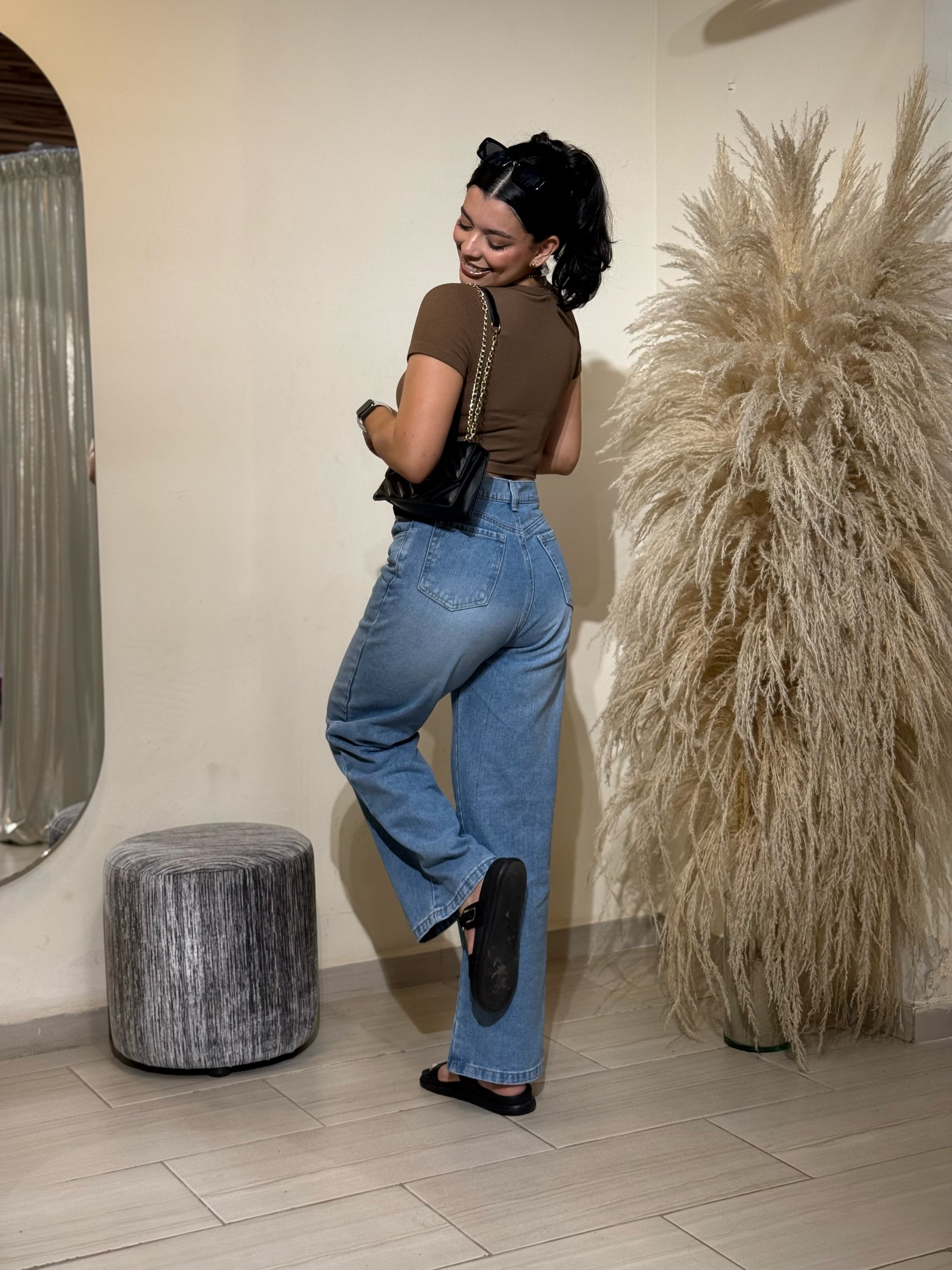 Pantalón tiro alto, diseño de bota ancha, 5 bolsillos funcionales con forro, cierre y botón frontal. Su diseño Wide Leg es ideal para que resaltes tu figura sin perder la comodidad de la que tanto disfrutas en tu día a día. Elaborado en denim rígido.