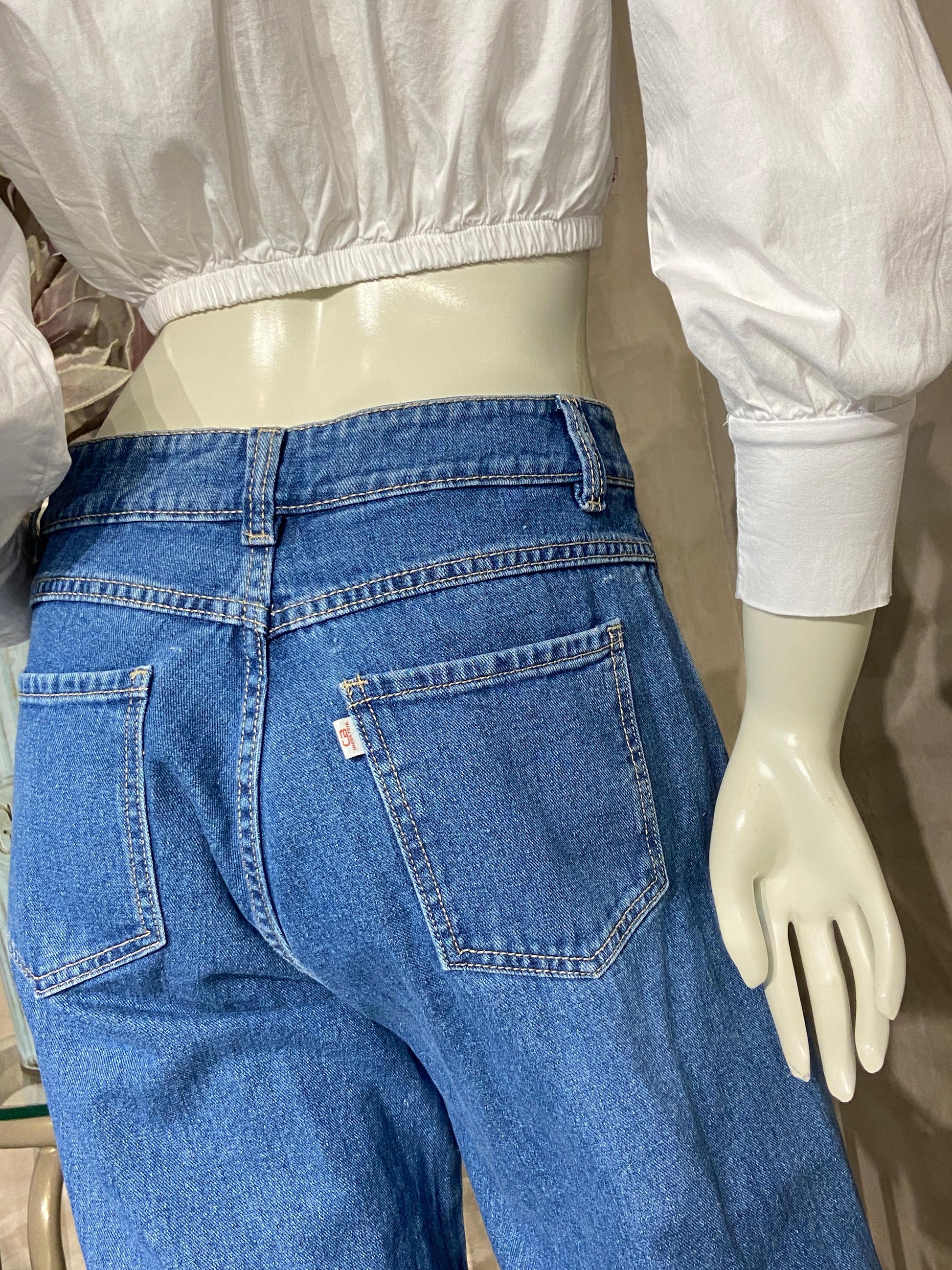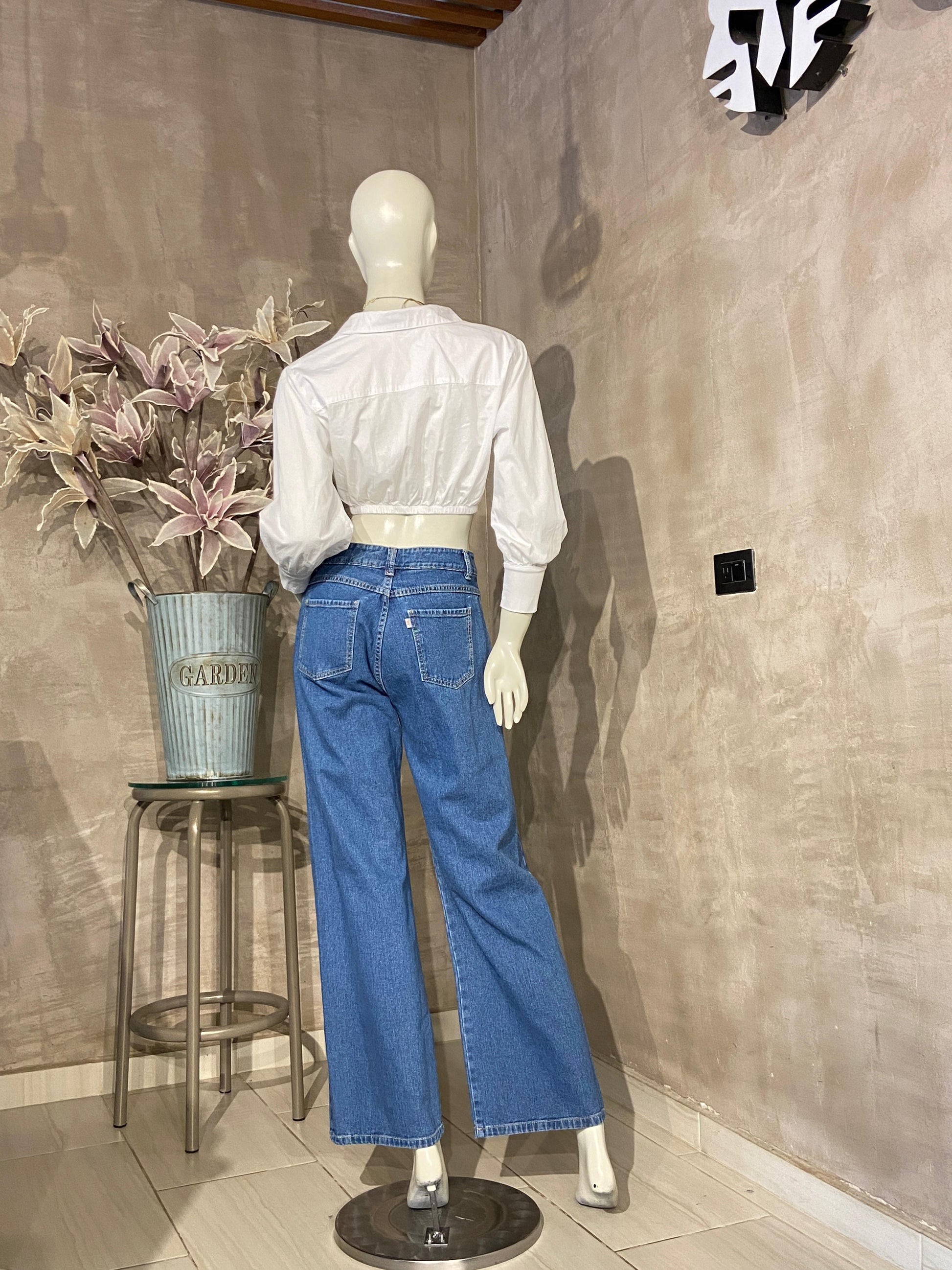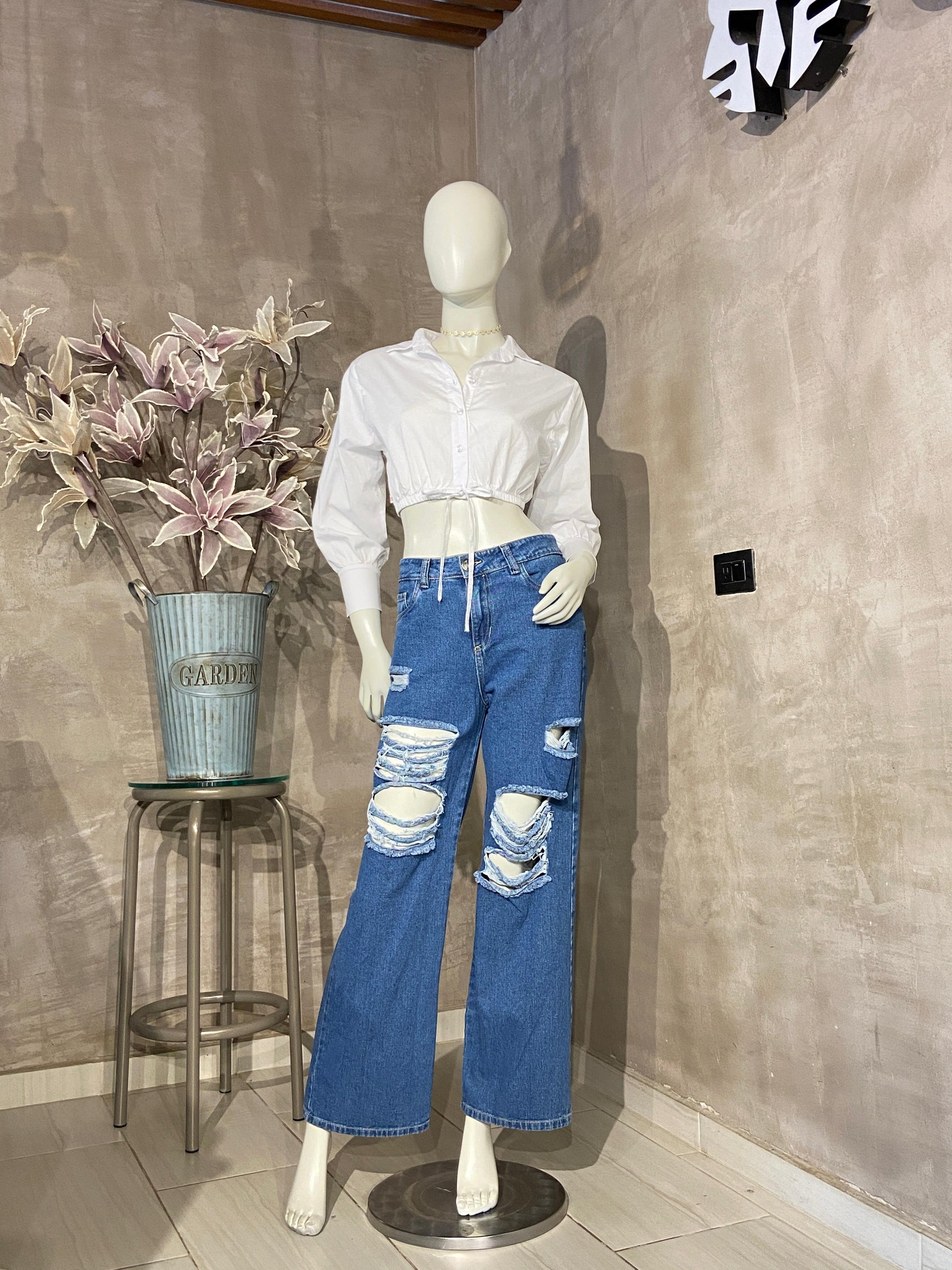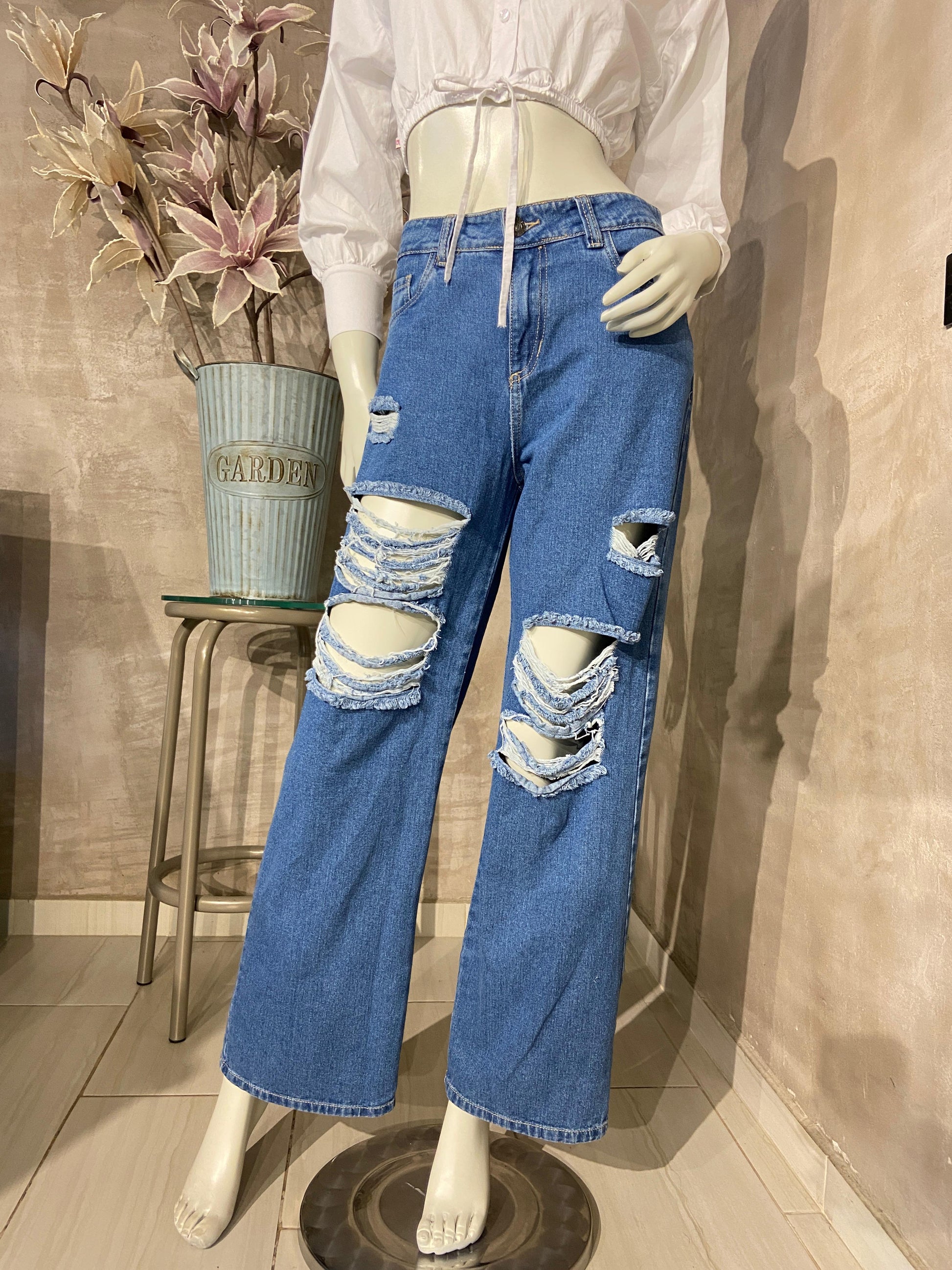 Pantalón wide leg, bota recta, 5 bolsillos, tiro alto, con cierre, con rotos, elaborado en denim rígido 100% Algodón.