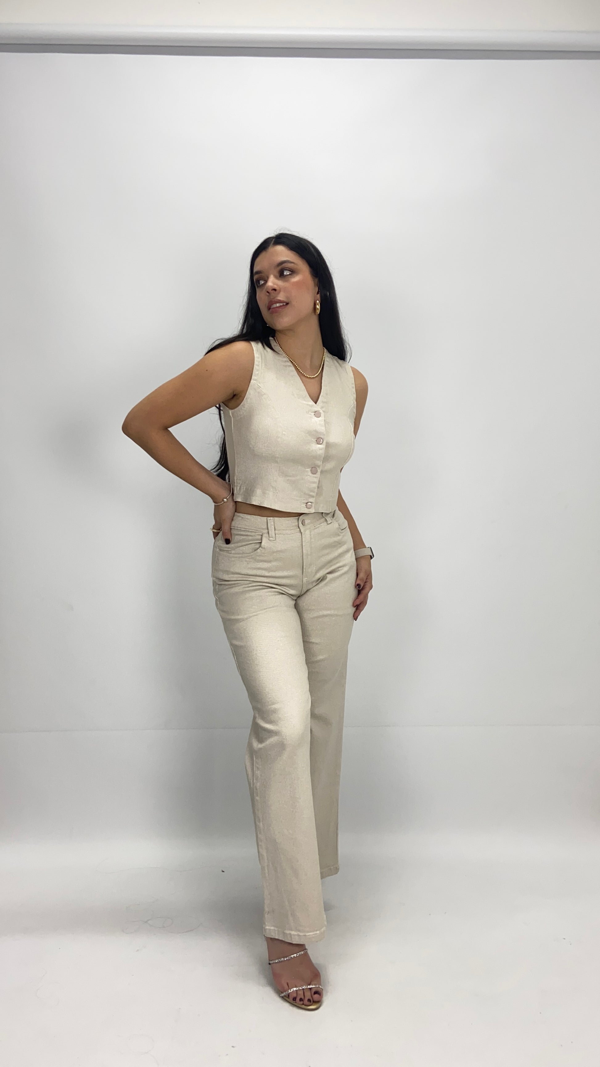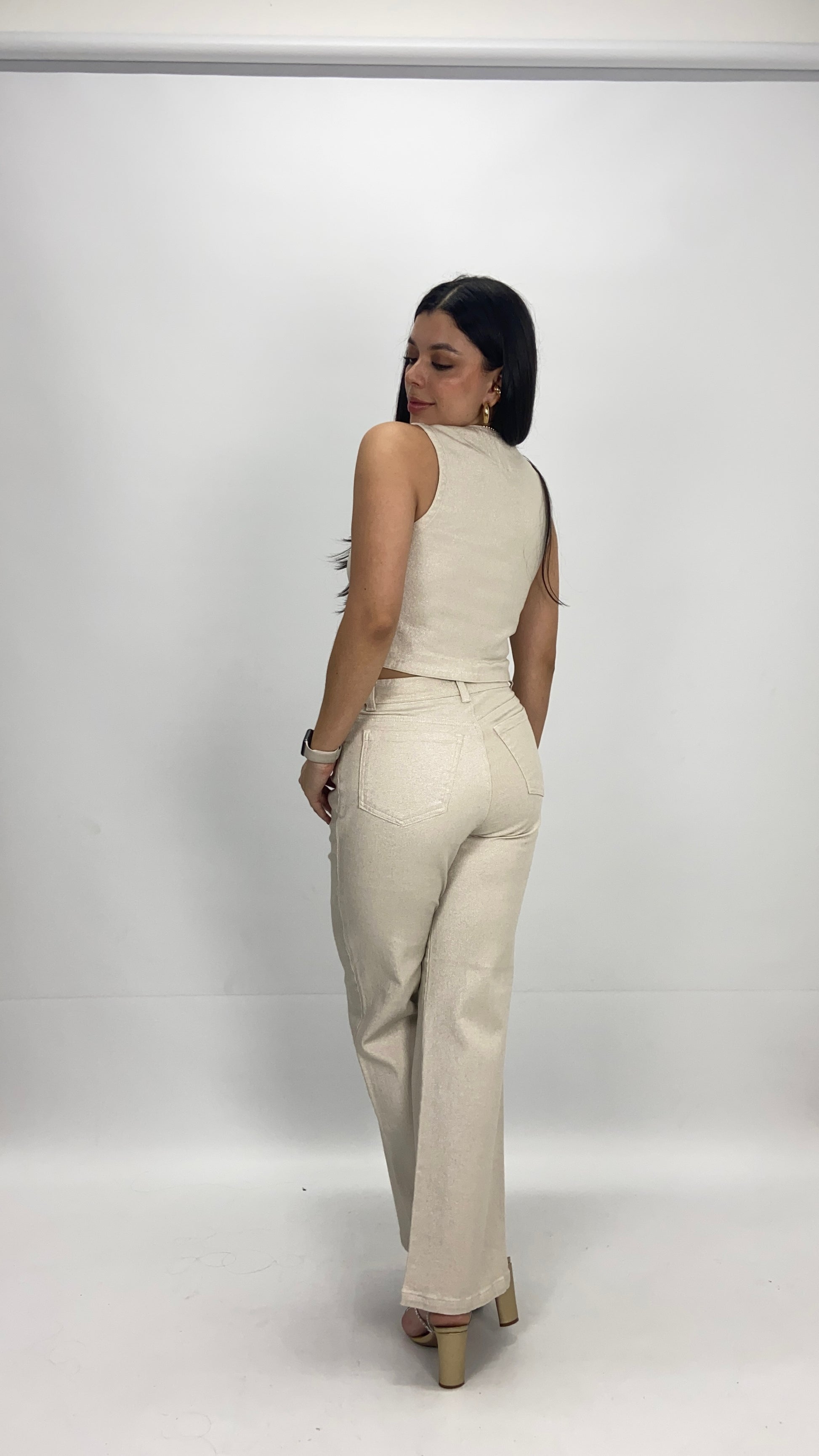 Pantalón clásico 5 bolsillos, cuenta con 2 bolsillos posteriores, tiro alto, bota recta con una silueta ajustada desde la cintura hasta la rodilla. Elaborado en drill licrado brillante.
