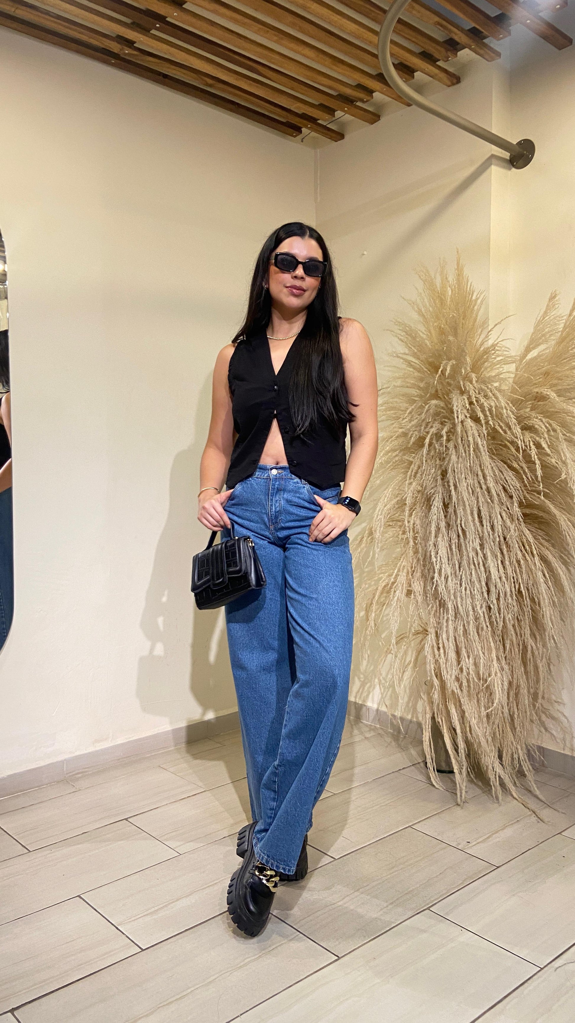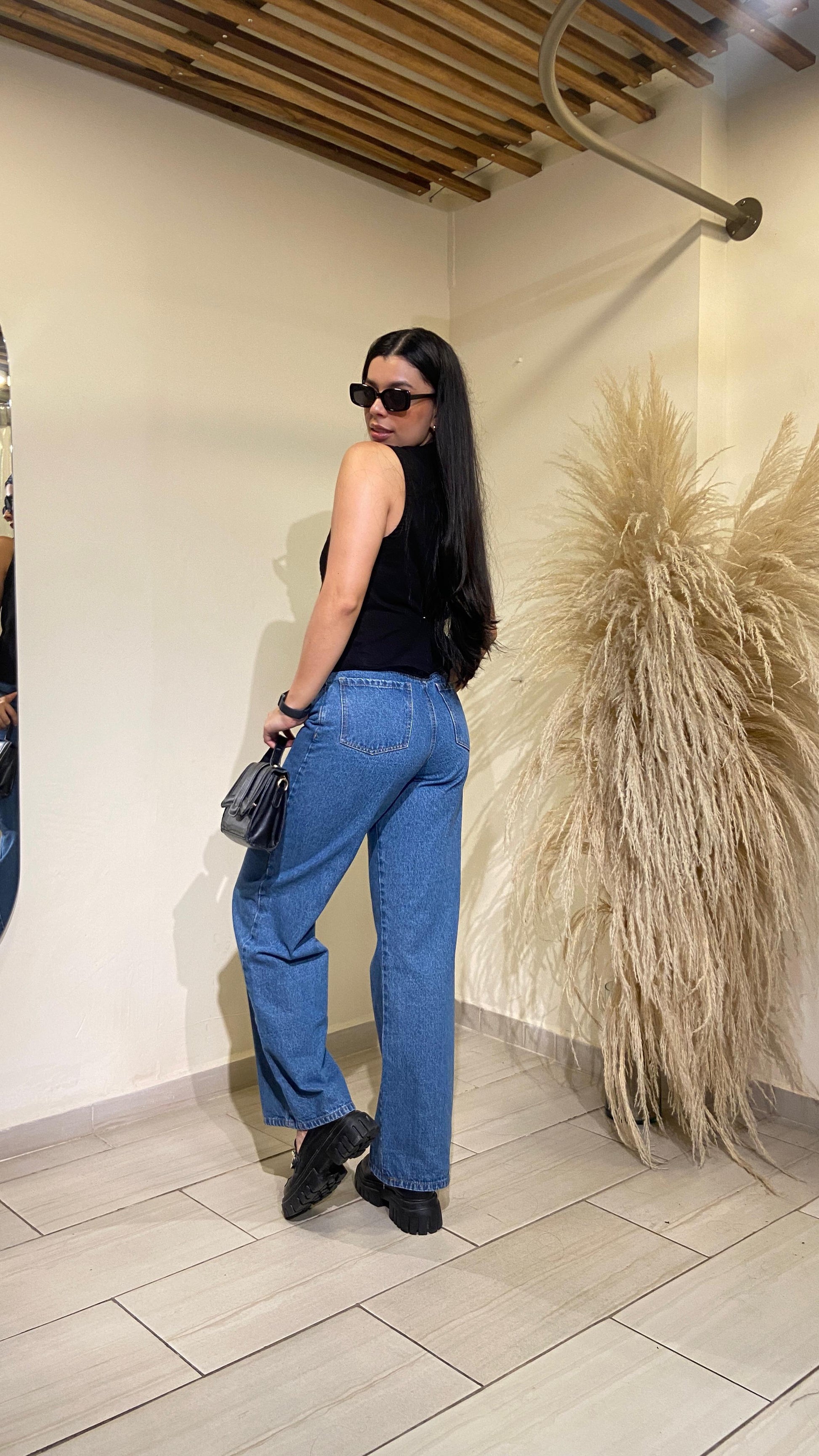 Pantalón tiro alto, diseño de bota ancha, 5 bolsillos funcionales con forro, cierre y botón frontal. Su diseño Wide Leg es ideal para que resaltes tu figura sin perder la comodidad de la que tanto disfrutas en tu día a día. Elaborado en denim rígido.