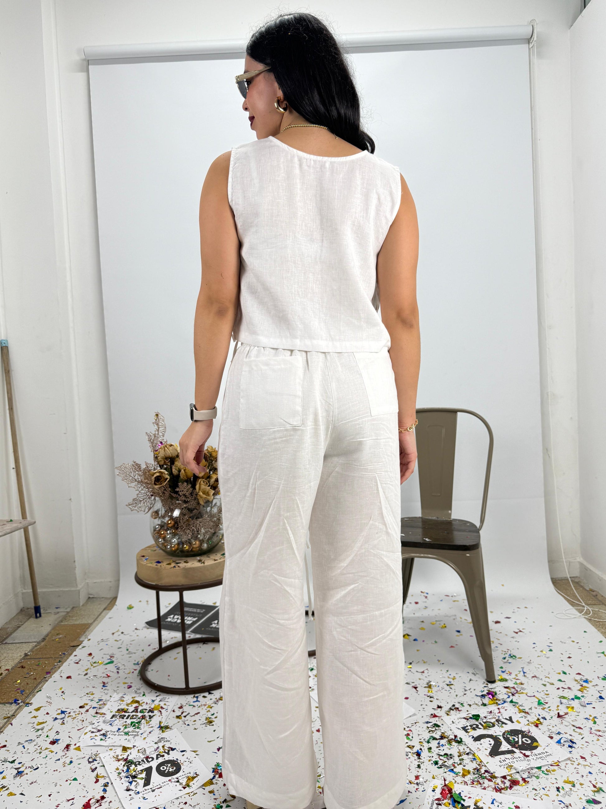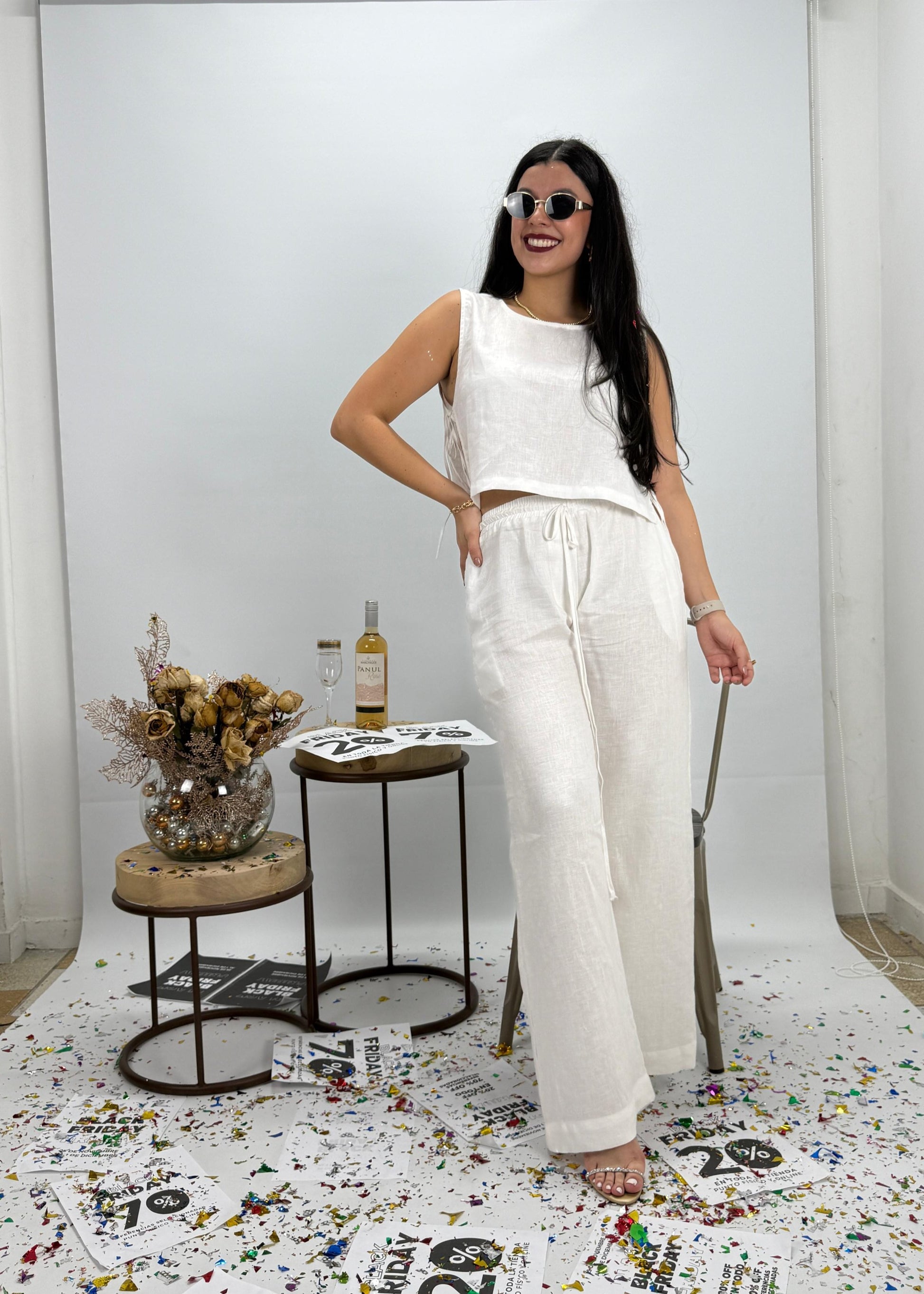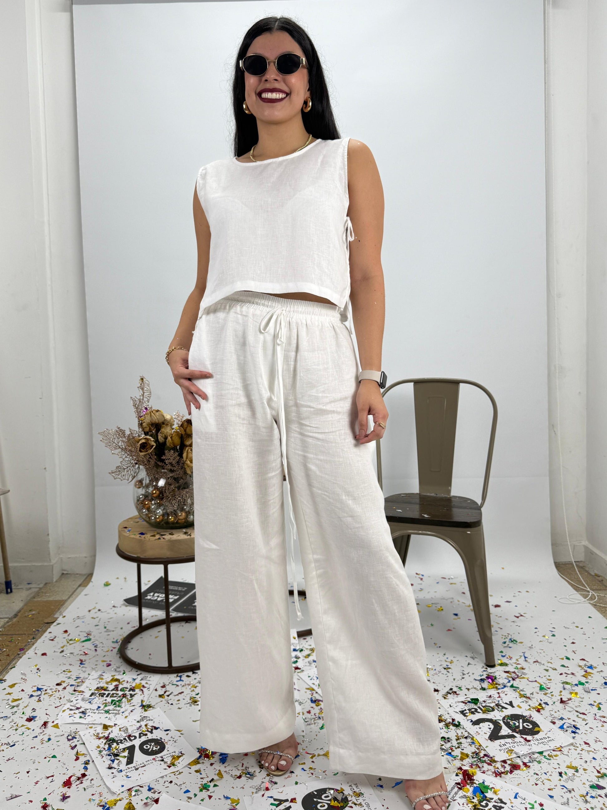 Set de 2 piezas. Blusa cuello redondo con aberturas laterales con sistema de amarre de tiras. Pantalón silueta amplia, tiro alto, encauchado con cordón ajustable, bolsillos funcionales, bota recta. Elaborado en lino 100% Algodón.