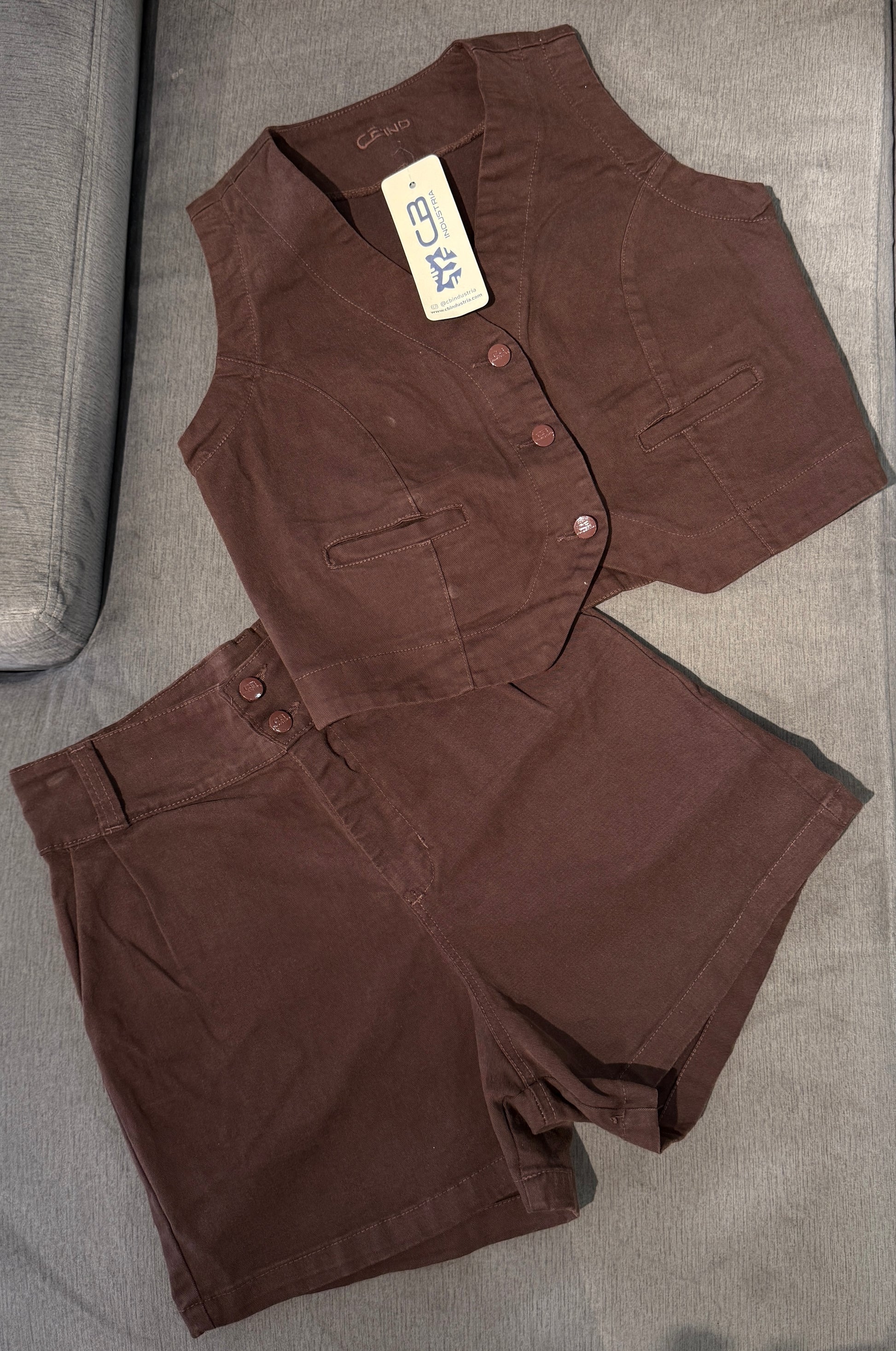 Set de 2 piezas con chaleco de botones y short tiro alto con bolsillos laterales funcionales. Elaborado en drill strech .