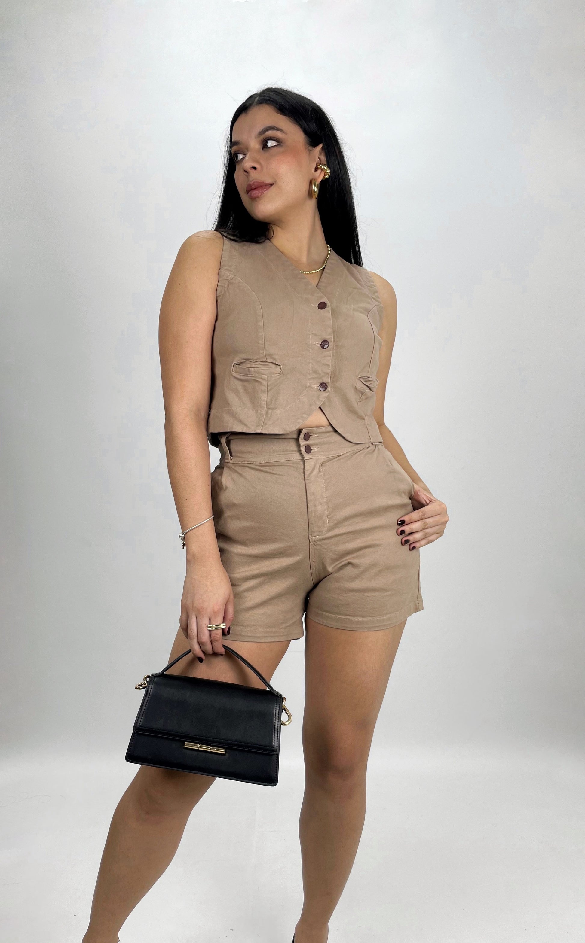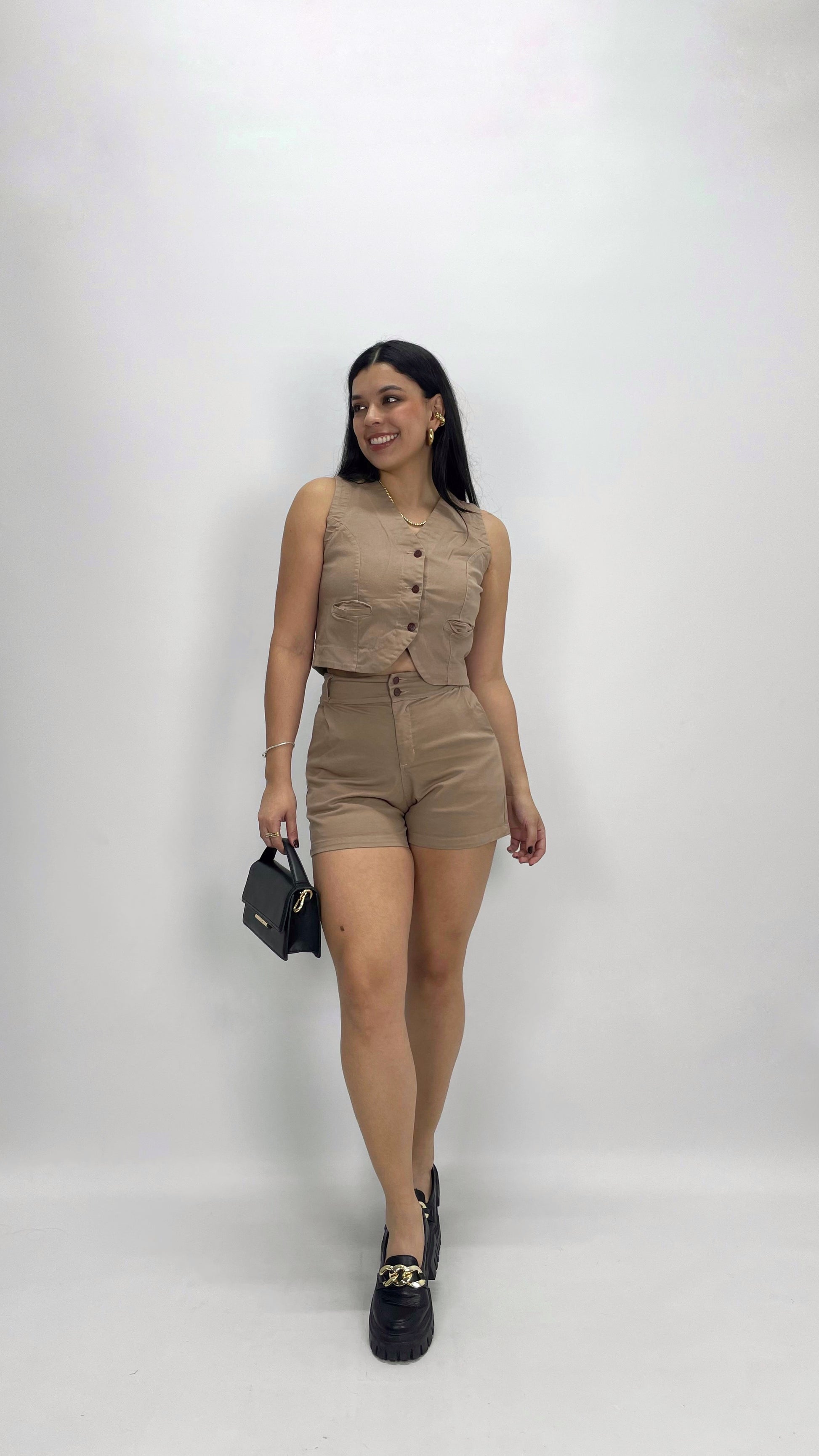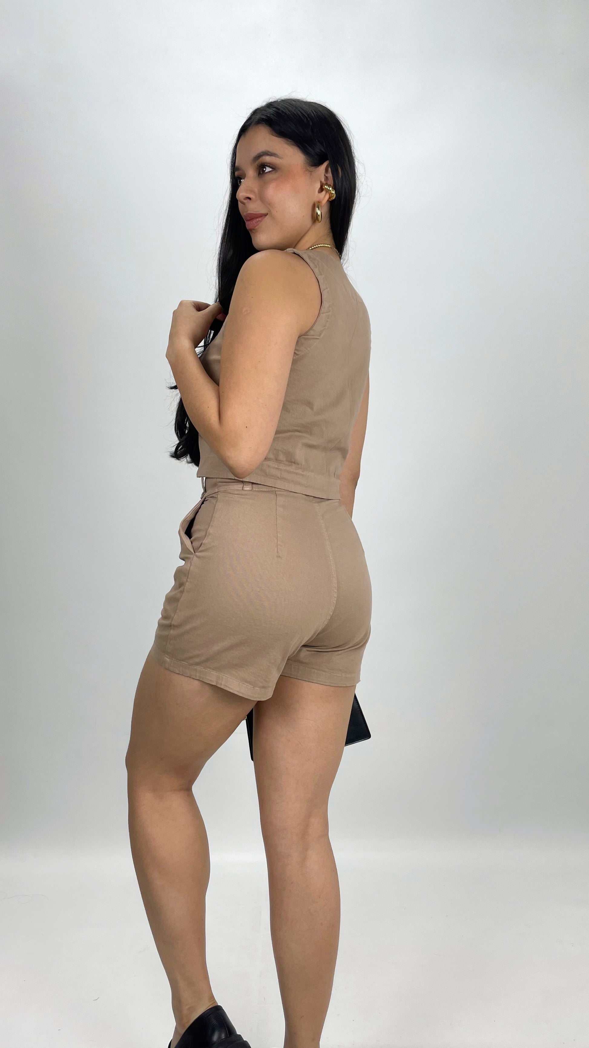 Set de 2 piezas con chaleco de botones y short tiro alto con bolsillos laterales funcionales. Elaborado en drill strech .