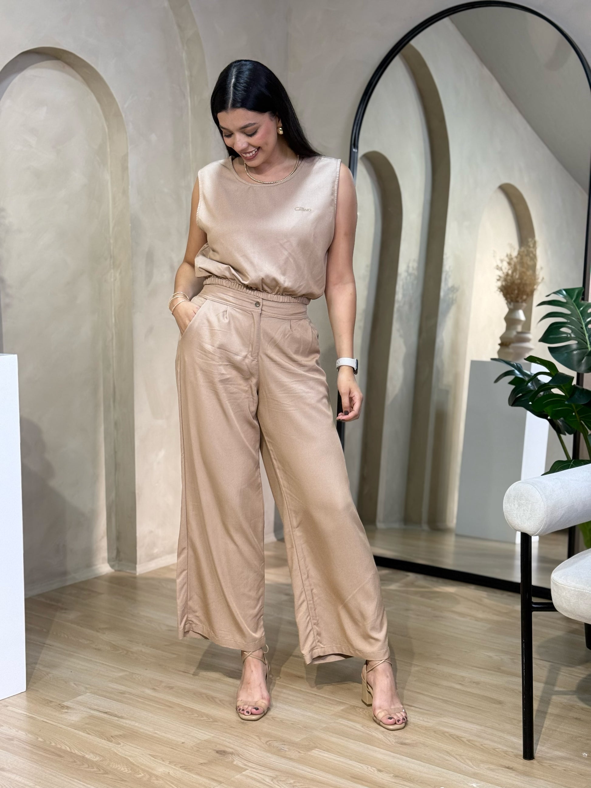 Set de 2 piezas, blusa manga sisa, cuello redondo con sistema de cierre de botones en el cuello y encauchada a la cintura. Pantalón tiro alto, encauchado en la cintura en la parte posterior y con pretina con botón y cierre al frente, con bolsillos laterales y posteriores funcionales y bota amplia. Elaborado en chambray 100% algodón.