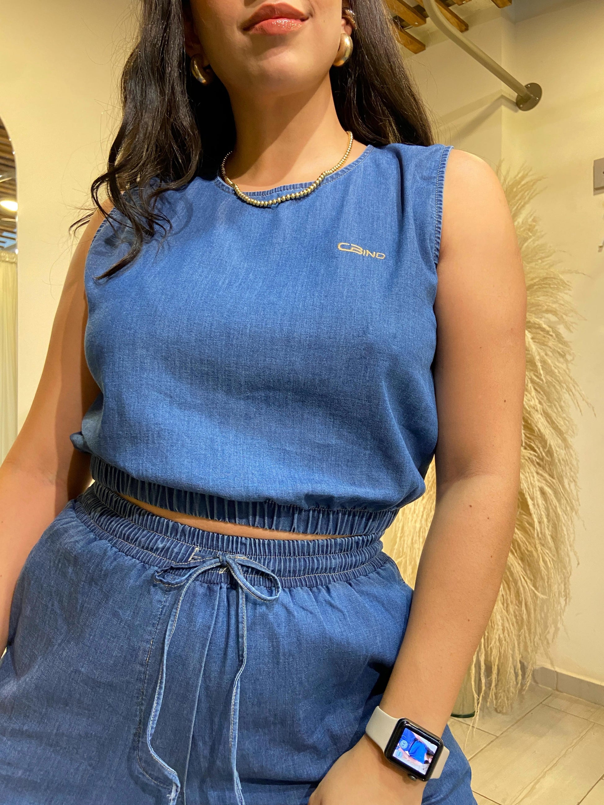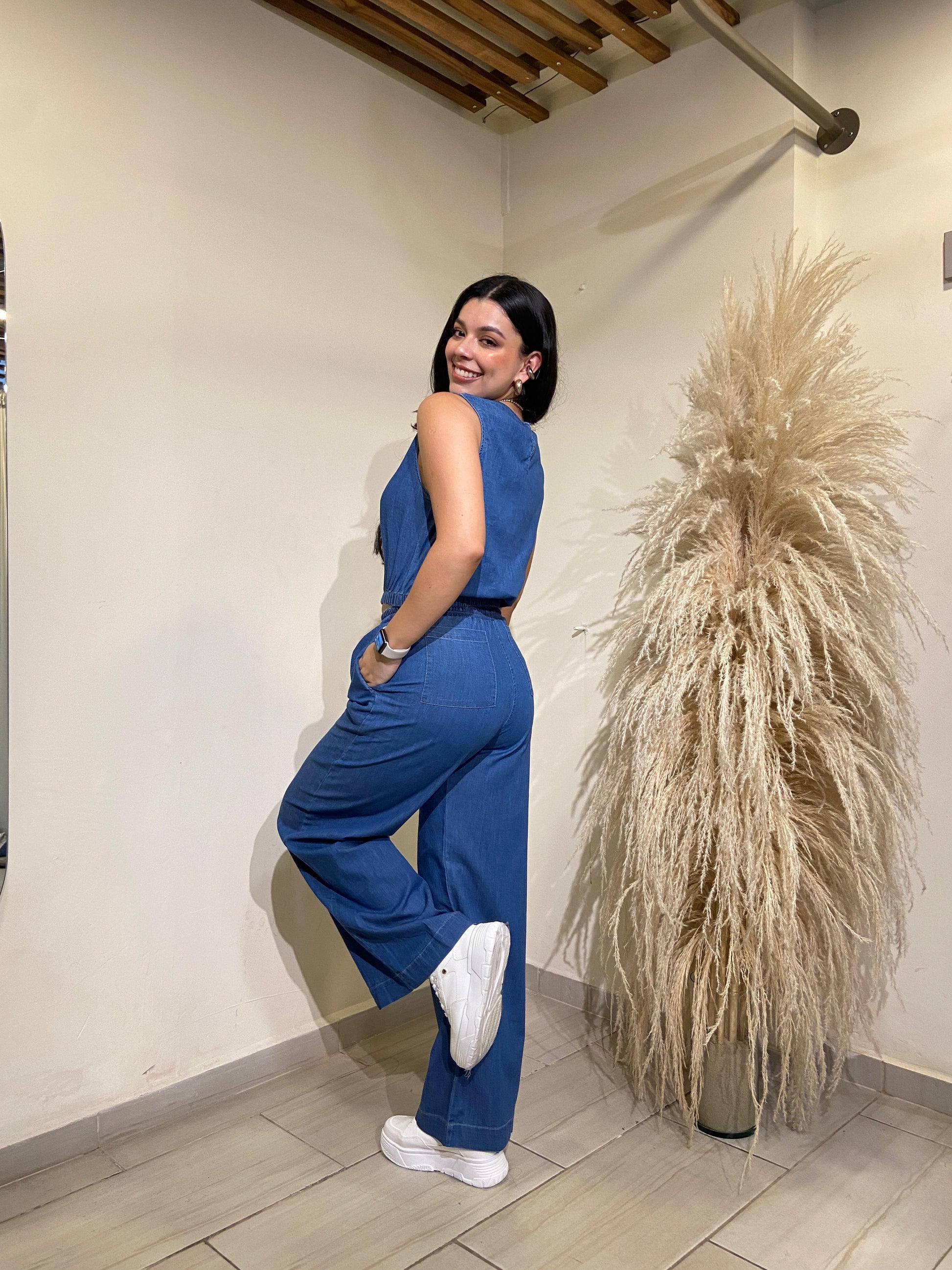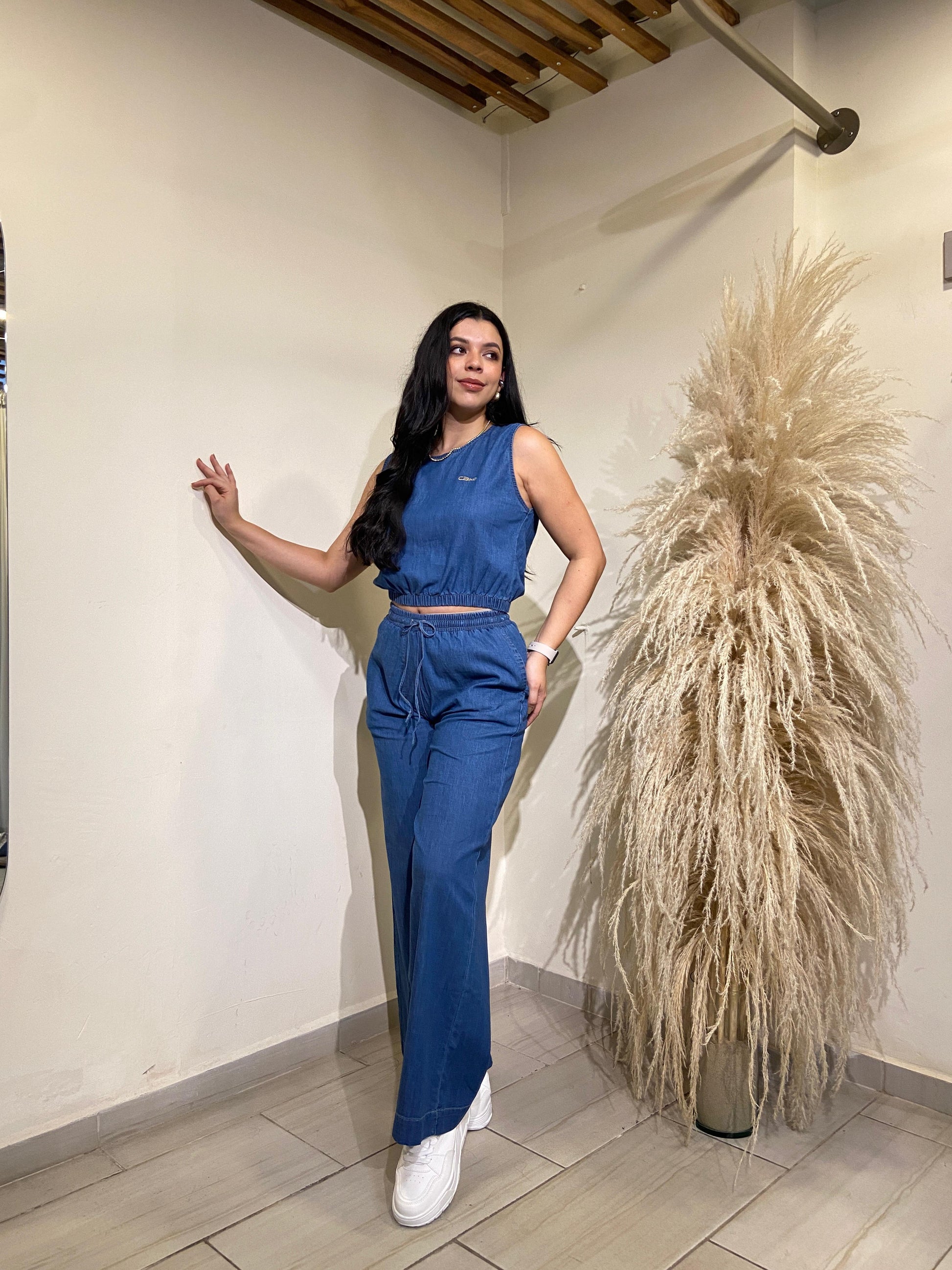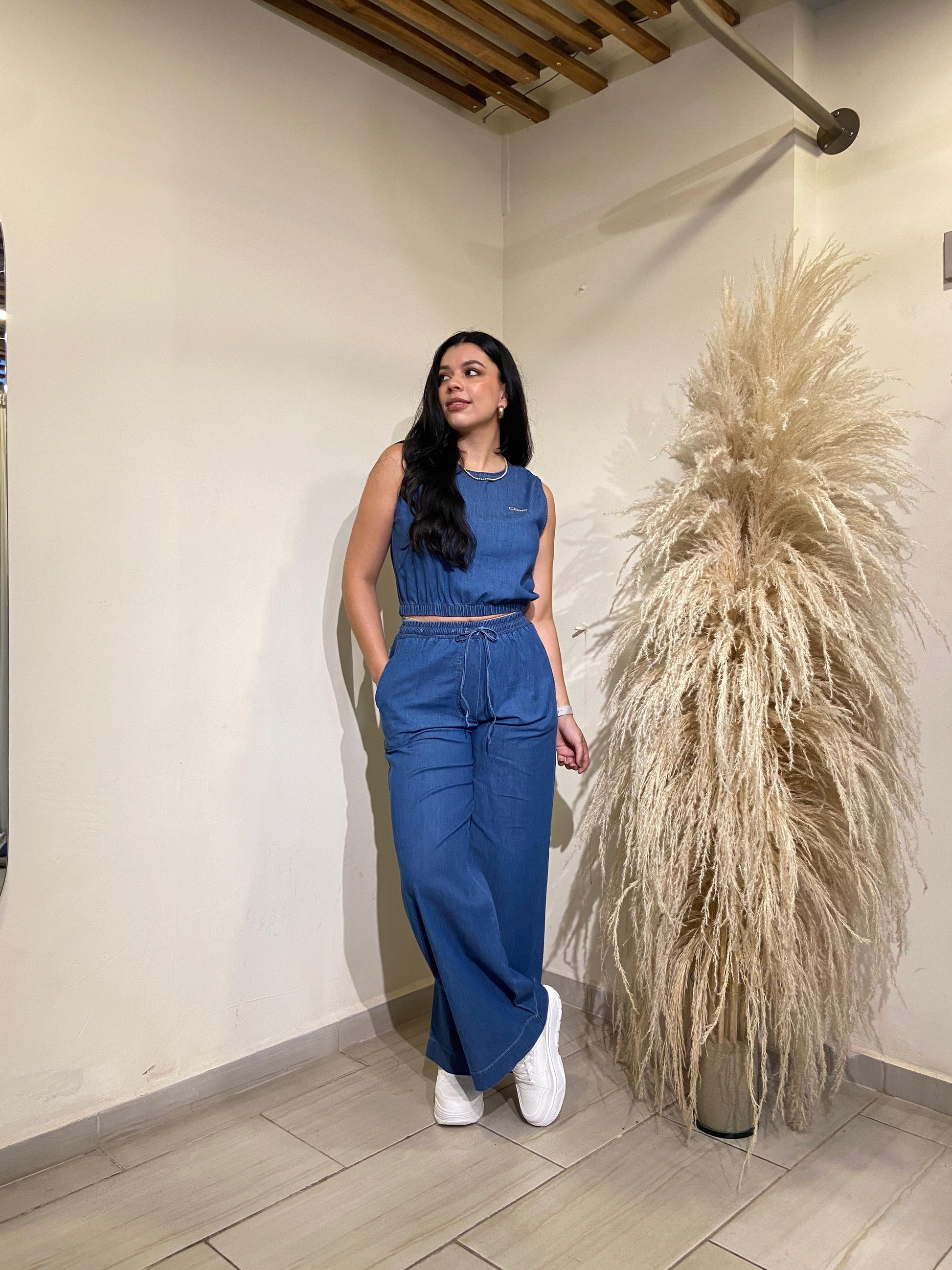 Set de 2 piezas, blusa manga sisa, cuello redondo y encauchada a la cintura. Pantalón tiro alto, encauchado en la cintura con bolsillos laterales y posteriores funcionales y bota amplia. Elaborado en denim chambray 100% algodón.