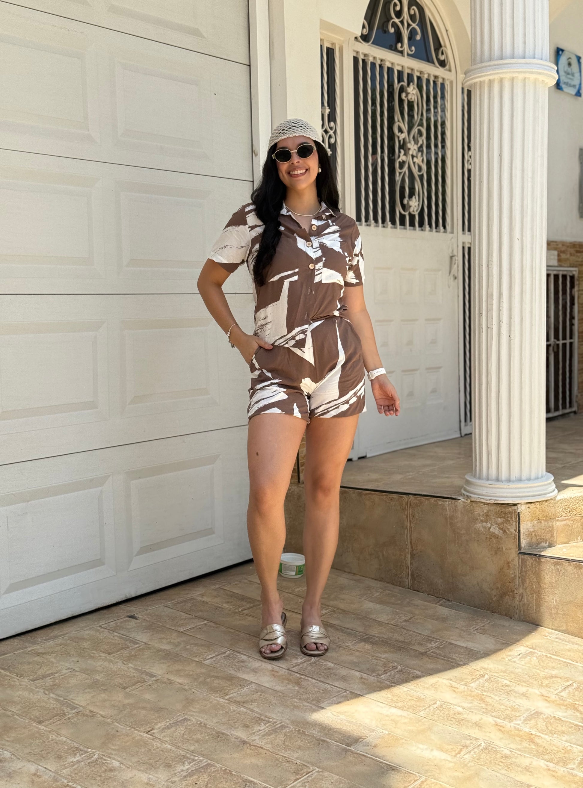 Set de 2 piezas con camisera de botones y short tiro alto con pretina encauchada en la parte posterior, con bolsillos laterales funcionales. Elaborado en chalis.