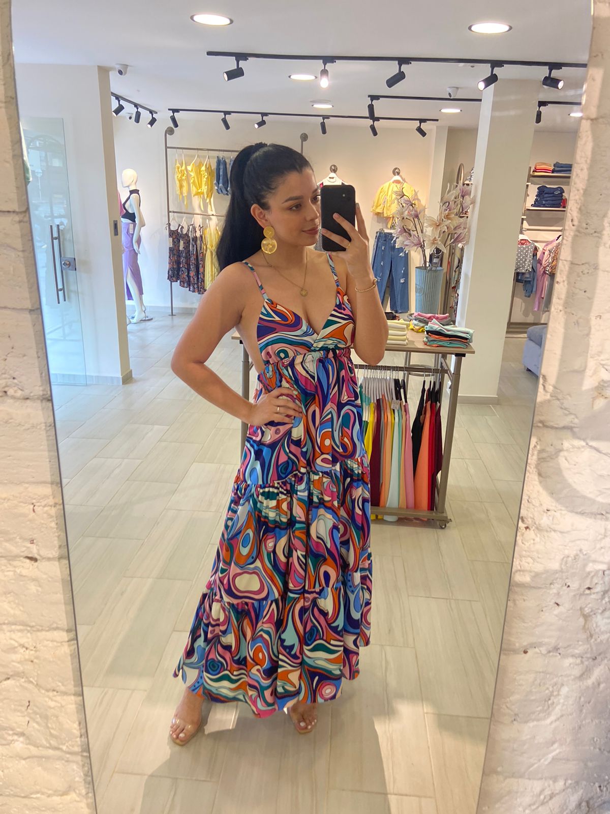 Vestido largo de tiras graduables, copas forradas, cortes con bolero en falda, elástico en escote posterior. Elaborado en seda.