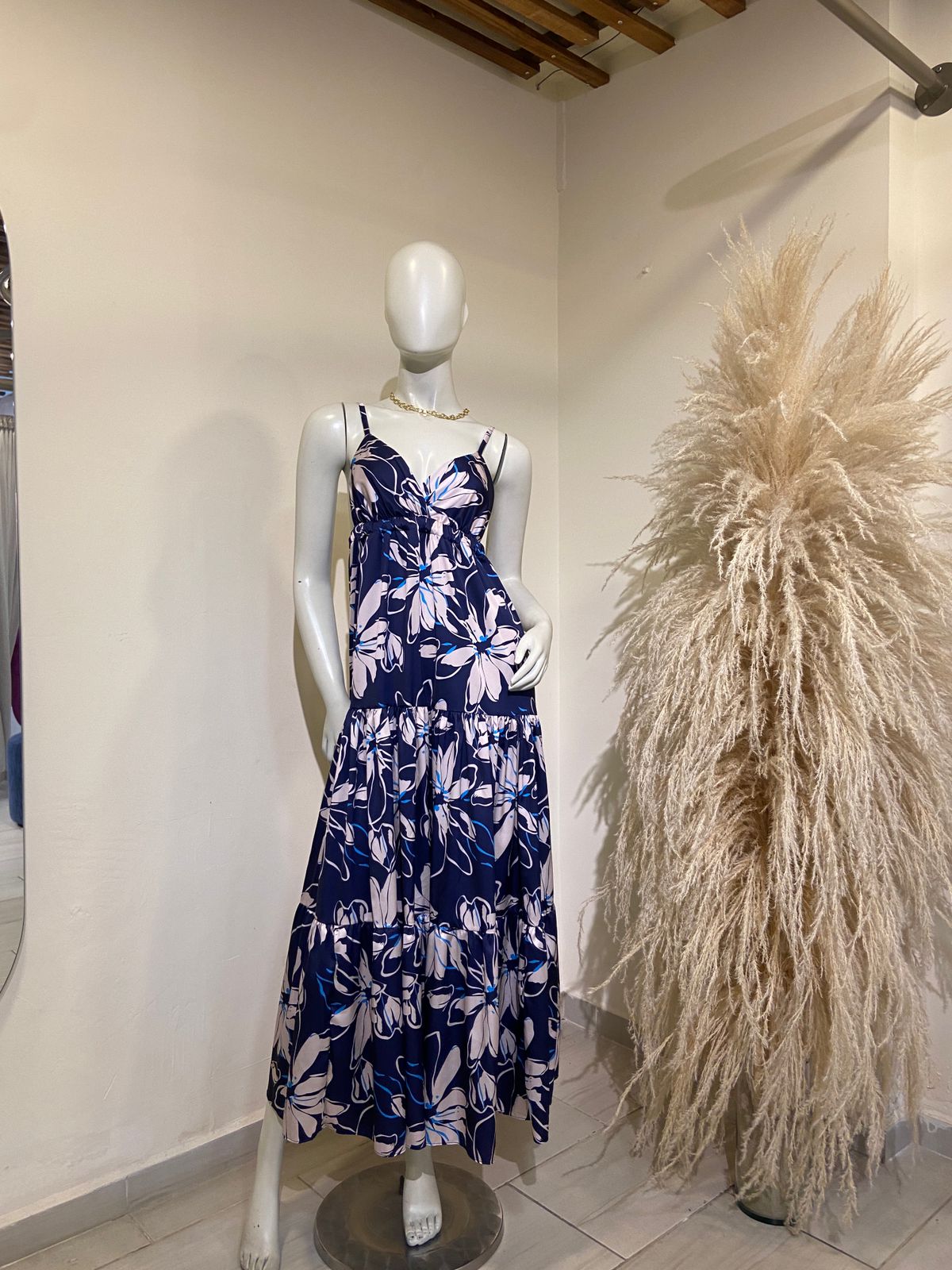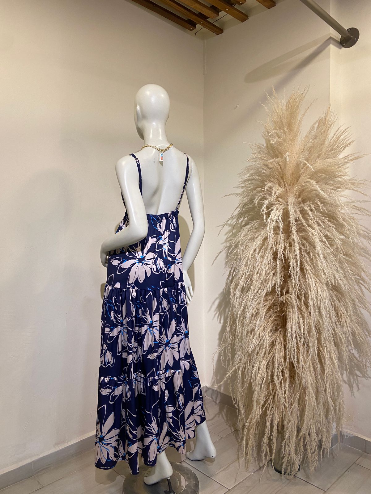 Vestido largo de tiras graduables, copas forradas, cortes con bolero en falda, elástico en escote posterior. Elaborado en seda.