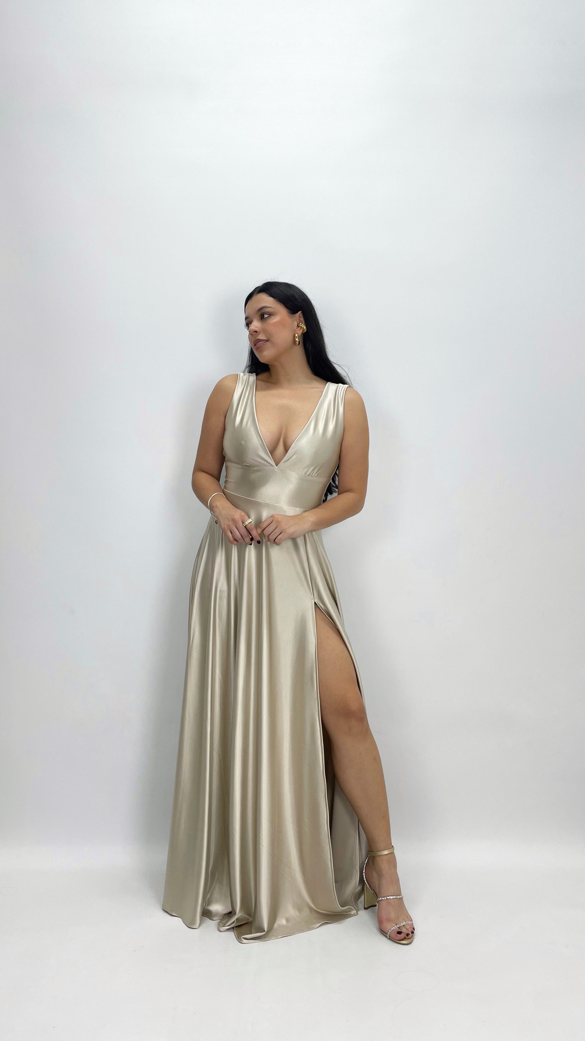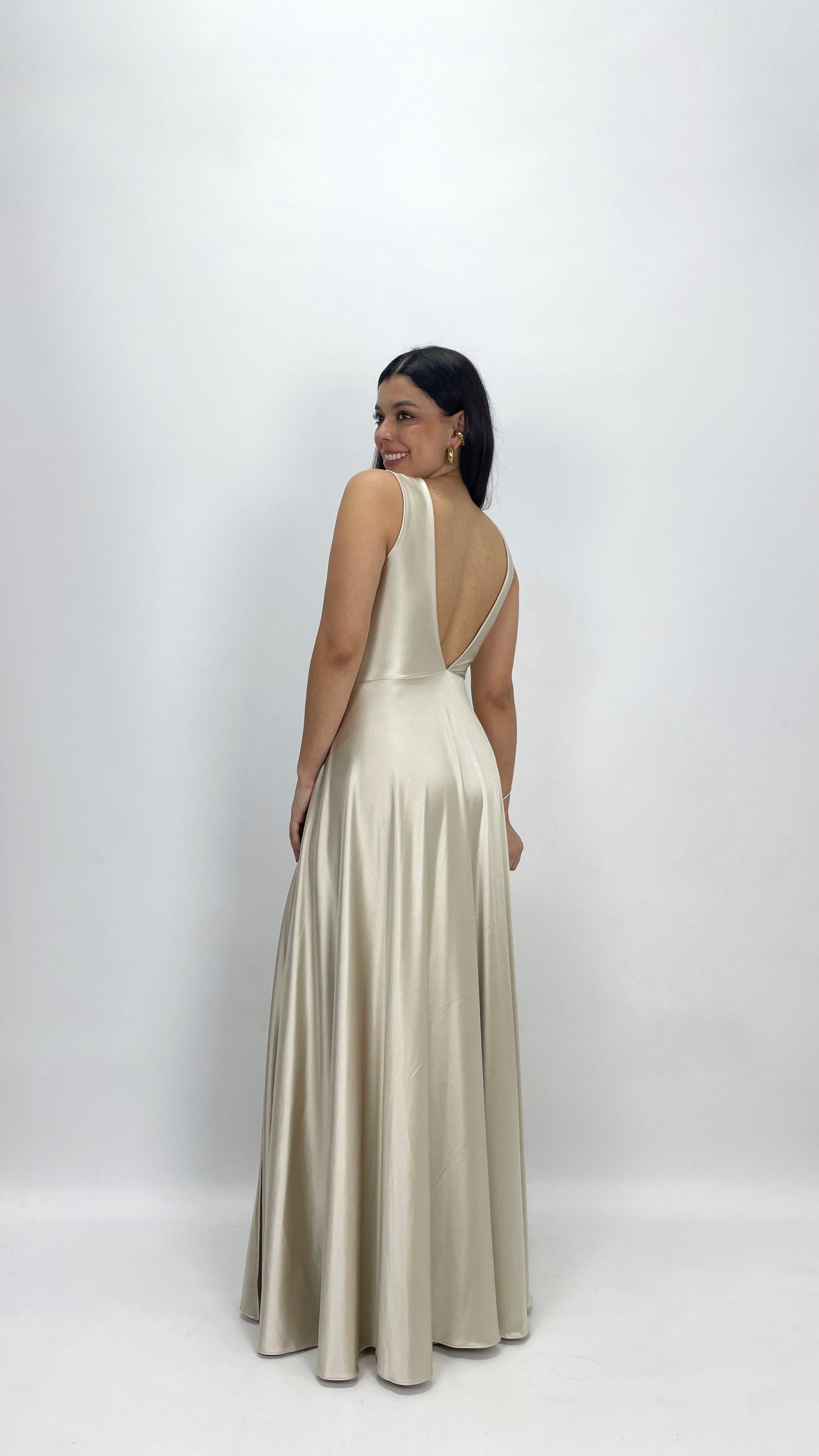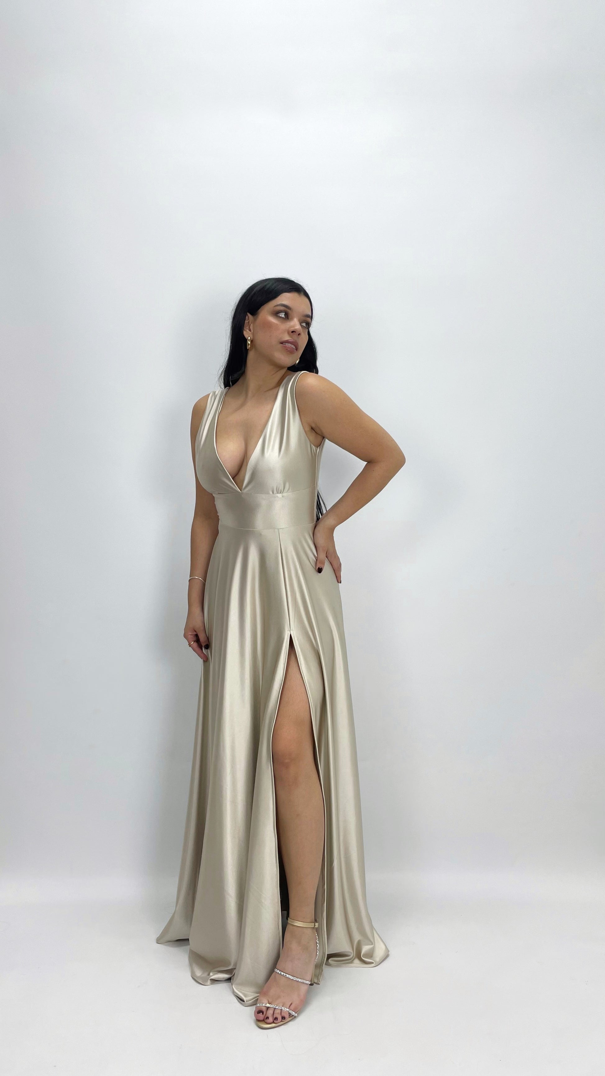Vestido en satín grueso y licrado con escote profundo, falda amplia con abertura. Funciona S/M y M/L.