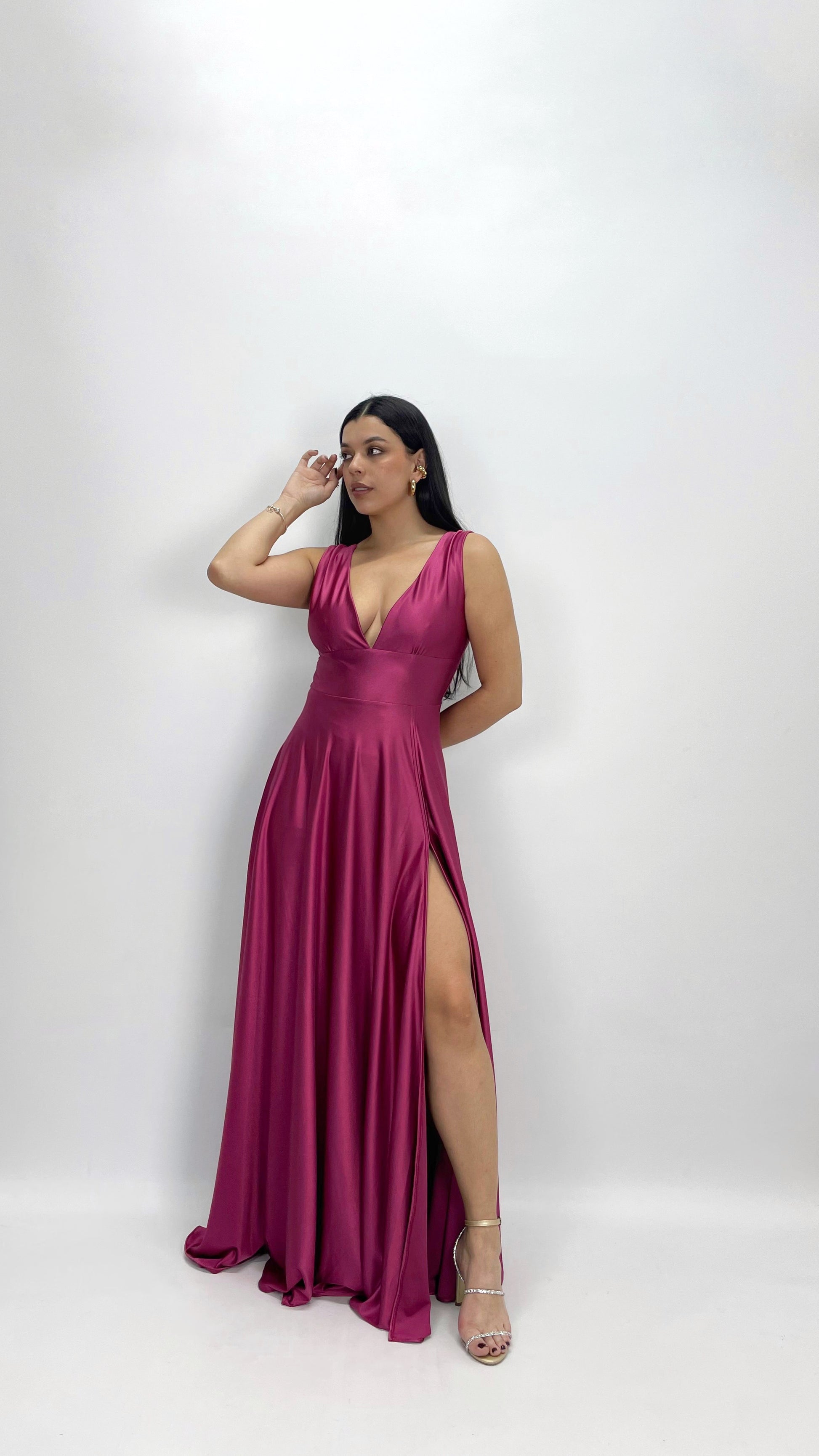 Vestido en satín grueso y licrado con escote profundo, falda amplia con abertura. Funciona S/M y M/L.