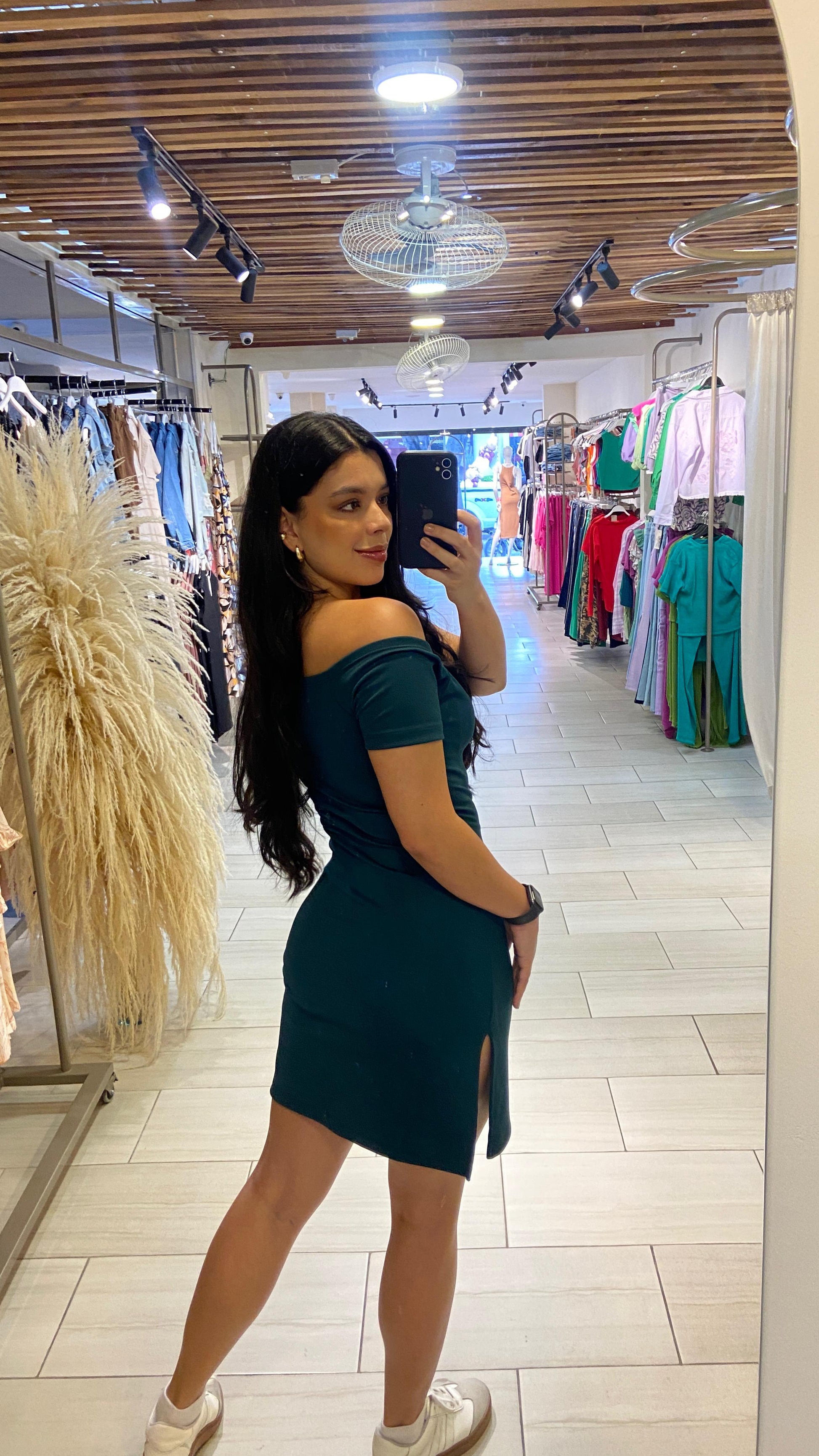 Vestido corto, cuello bandeja strech con aberturas laterales.